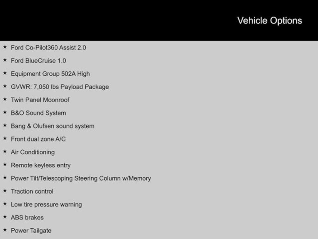 2023 Ford F-150 4WD, 2nd Row Heated Seats, 360 Degree Camera, ABS brakes, Active Park Assist 2.0, Air Conditioning, Alloy wheels, B&O Sound System, Bang & Olufsen sound system, Compass, Connected Built-In Navigation, Electronic Locking w/3.55 Axle Ratio, Electronic Stability Control, Equipment Group 502A High, Evasive Steering Assist, Extended Range 36 Gallon Fuel Tank, Ford BlueCruise 1.0, Ford Co-Pilot360 Assist 2.0, Front dual zone A/C, GVWR: 7,050 lbs Payload Package, Heated door mirrors, Heated front seats, Illuminated entry, Intelligent Adaptive Cruise Control w/Stop & Go, Intersection Assist, LED Projector w/Dynamic Bending Headlamps, Low tire pressure warning, Power Tailgate, Power Tilt/Telescoping Steering Column w/Memory, Rain-Sensing Wipers, Remote keyless entry, Speed Sign Recognition, SYNC 4 w/Enhanced Voice Recognition, Traction control, Twin Panel Moonroof, Wheel Well Liner, Wheels: 20'' Chrome-Like PVD, Wireless Charging Pad.Welcome to Huntley Ford Serving Huntley, Elgin, Algonquin, Crystal Lake, Woodstock, Hampshire, Marengo, Dundee & Lake in the Hills Have you been hunting for an all inclusive car dealership that specializes in all things Ford? Then you've arrived at the right place! At Huntley Ford in Huntley, IL, we offer a full range of automotive services that cater to every one of our customer's wishes. Whether you need a brand new Ford, a pre-owned vehicle from any number of manufacturers, help from our finance team, or auto service performed by our team of technicians, we're sure to be your new one-stop shop for all of your automotive needs.