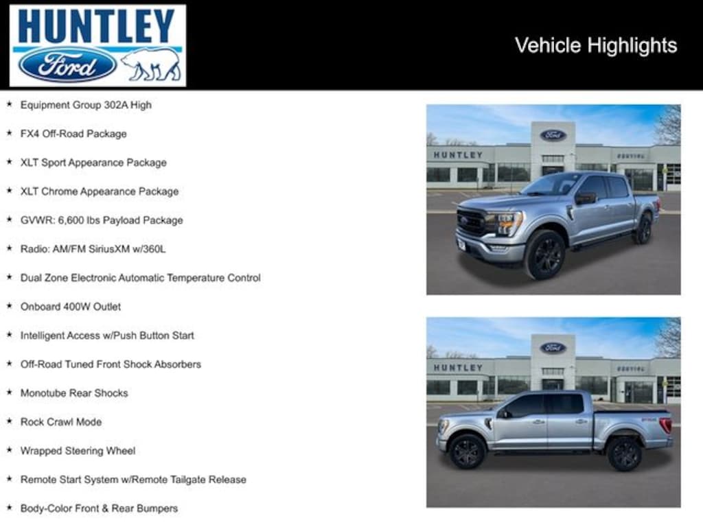 2023 Ford F-150 4WD, 10-Way Power Driver & Passenger Seats, 2-Bar Style Grille w/Chrome 2 Minor Bars, 4x4 FX4 Off-Road Bodyside Decal, 8" Productivity Screen in Instrument Cluster, Accent-Color Step Bars, Auto-Dimming Rear-View Mirror, Black 2-Bar Style Grille w/Black Surround/Accents, Body-Color Door & Tailgate Handles, Body-Color Front & Rear Bumpers, Box Side Decals, Bright Polished Step Bars, Chrome Door & Tailgate Handles w/Body-Color Bezel, Chrome Single-Tip Exhaust, Class IV Trailer Hitch Receiver, Dual Zone Electronic Automatic Temperature Control, Electronic Locking w/3.55 Axle Ratio, Equipment Group 302A High, FX4 Off-Road Package, GVWR: 6,600 lbs Payload Package, Heated Front Seats, Hill Descent Control, Intelligent Access w/Push Button Start, LED Reflector Headlamps, LED Sideview Mirror Spotlights, Monotube Rear Shocks, Off-Road Tuned Front Shock Absorbers, Onboard 400W Outlet, Power Glass Heated Sideview Mirrors, Radio: AM/FM SiriusXM w/360L, Rear Under-Seat Storage, Remote Start System w/Remote Tailgate Release, Rock Crawl Mode, SecuriCode Drivers Side Keyless-Entry Keypad, SYNC 4 w/Enhanced Voice Recognition, Unique Sport Cloth 40/Console/40 Front-Seats, Wheels: 18" 6-Spoke Machined Aluminum, Wheels: 18" Chrome-Like PVD, Wrapped Steering Wheel, XLT Chrome Appearance Package, XLT Sport Appearance Package, Zone Lighting. CARFAX One-Owner.