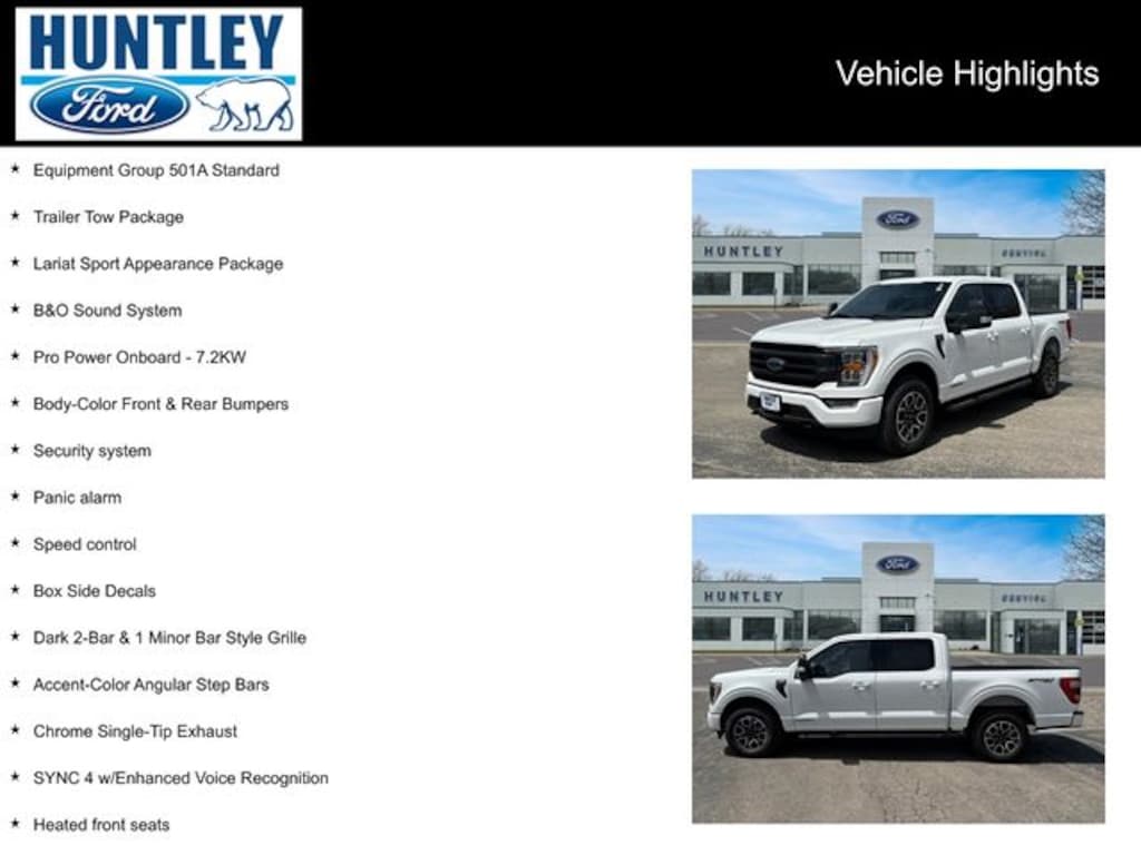 2023 Ford F-150 3.5L PowerBoost Full-Hybrid V6, 4WD, Accent-Color Angular Step Bars, B&O Sound System, Body-Color Front & Rear Bumpers, Box Side Decals, Chrome Single-Tip Exhaust, Class IV Trailer Hitch Receiver, Dark 2-Bar & 1 Minor Bar Style Grille, Equipment Group 501A Standard, Heated front seats, Integrated Trailer Brake Controller, Lariat Sport Appearance Package, Panic alarm, Pro Power Onboard - 7.2KW, Pro Trailer Backup Assist & Pro Trailer Hitch Assist, Security system, Speed control, SYNC 4 w/Enhanced Voice Recognition, Trailer Tow Package, Ventilated front seats, Wheels: 18" 6-Spoke Machined Aluminum. Clean CARFAX.