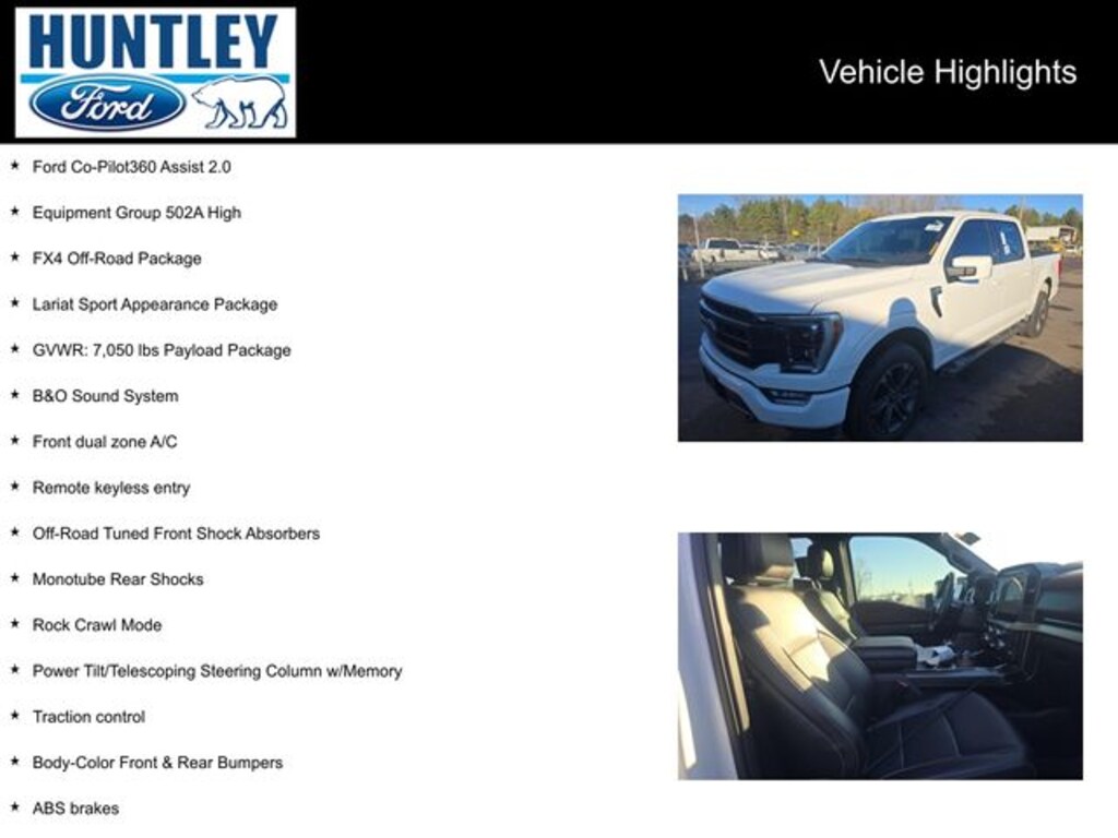 2023 Ford F-150 4WD, 2nd Row Heated Seats, 4x4 FX4 Off-Road Bodyside Decal, ABS brakes, Accent-Color Angular Step Bars, Alloy wheels, B&O Sound System, Body-Color Front & Rear Bumpers, Box Side Decals, Chrome Single-Tip Exhaust, Compass, Connected Built-In Navigation, Dark 2-Bar & 1 Minor Bar Style Grille, Electronic Locking w/3.31 Axle Ratio, Electronic Stability Control, Equipment Group 502A High, Evasive Steering Assist, Ford Co-Pilot360 Assist 2.0, Front dual zone A/C, FX4 Off-Road Package, GVWR: 7,050 lbs Payload Package, Heated door mirrors, Heated front seats, Hill Descent Control, Illuminated entry, Intelligent Adaptive Cruise Control w/Stop & Go, Intersection Assist, Lariat Sport Appearance Package, LED Projector w/Dynamic Bending Headlamps, Low tire pressure warning, Monotube Rear Shocks, Off-Road Tuned Front Shock Absorbers, Power Tilt/Telescoping Steering Column w/Memory, Rain-Sensing Wipers, Remote keyless entry, Rock Crawl Mode, Speed Sign Recognition, SYNC 4 w/Enhanced Voice Recognition, Traction control, Wheels: 20" Chrome-Like PVD, Wireless Charging Pad. Clean CARFAX.