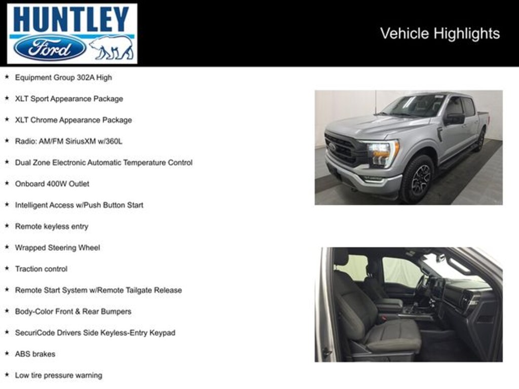 2023 Ford F-150 4WD, 10-Way Power Driver & Passenger Seats, 2-Bar Style Grille w/Chrome 2 Minor Bars, 6" Extended Dark Gray Accent Running Board, 8" Productivity Screen in Instrument Cluster, ABS brakes, Accent-Color Step Bars, Alloy wheels, Auto-Dimming Rear-View Mirror, Black 2-Bar Style Grille w/Black Surround/Accents, Body-Color Door & Tailgate Handles, Body-Color Front & Rear Bumpers, Box Side Decals, Bright Polished Step Bars, Chrome Door & Tailgate Handles w/Body-Color Bezel, Chrome Single-Tip Exhaust, Class IV Trailer Hitch Receiver, Compass, Dual Zone Electronic Automatic Temperature Control, Electronic Stability Control, Equipment Group 302A High, Extended Range 36 Gallon Fuel Tank, Heated door mirrors, Heated Front Seats, Illuminated entry, Intelligent Access w/Push Button Start, LED Reflector Headlamps, LED Sideview Mirror Spotlights, Low tire pressure warning, Onboard 400W Outlet, Power Glass Heated Sideview Mirrors, Radio: AM/FM SiriusXM w/360L, Rear Under-Seat Storage, Remote keyless entry, Remote Start System w/Remote Tailgate Release, SecuriCode Drivers Side Keyless-Entry Keypad, SYNC 4 w/Enhanced Voice Recognition, Traction control, Unique Sport Cloth 40/Console/40 Front-Seats, Wheels: 18" 6-Spoke Machined Aluminum, Wheels: 18" Chrome-Like PVD, Wrapped Steering Wheel, XLT Chrome Appearance Package, XLT Sport Appearance Package, Zone Lighting.
