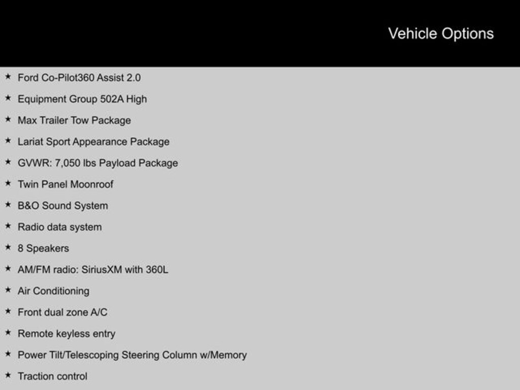 2023 Ford F-150 4WD, 2nd Row Heated Seats, 8 Speakers, ABS brakes, Accent-Color Angular Step Bars, Air Conditioning, Alloy wheels, AM/FM radio: SiriusXM with 360L, B&O Sound System, Body-Color Front & Rear Bumpers, Box Side Decals, Chrome Single-Tip Exhaust, Class IV Trailer Hitch Receiver, Compass, Connected Built-In Navigation, Dark 2-Bar & 1 Minor Bar Style Grille, Electronic Locking w/3.55 Axle Ratio, Electronic Stability Control, Equipment Group 502A High, Evasive Steering Assist, Extended Range 36 Gallon Fuel Tank, Ford Co-Pilot360 Assist 2.0, Front dual zone A/C, GVWR: 7,050 lbs Payload Package, Heated door mirrors, Heated front seats, Illuminated entry, Integrated Trailer Brake Controller, Intelligent Adaptive Cruise Control w/Stop & Go, Intersection Assist, Lariat Sport Appearance Package, LED Projector w/Dynamic Bending Headlamps, Low tire pressure warning, Max Trailer Tow Package, Power Tilt/Telescoping Steering Column w/Memory, Pro Trailer Backup Assist & Pro Trailer Hitch Assist, Radio data system, Rain-Sensing Wipers, Remote keyless entry, Speed Sign Recognition, SYNC 4 w/Enhanced Voice Recognition, Traction control, Twin Panel Moonroof, Wheels: 20" Chrome-Like PVD, Wireless Charging Pad. Clean CARFAX.