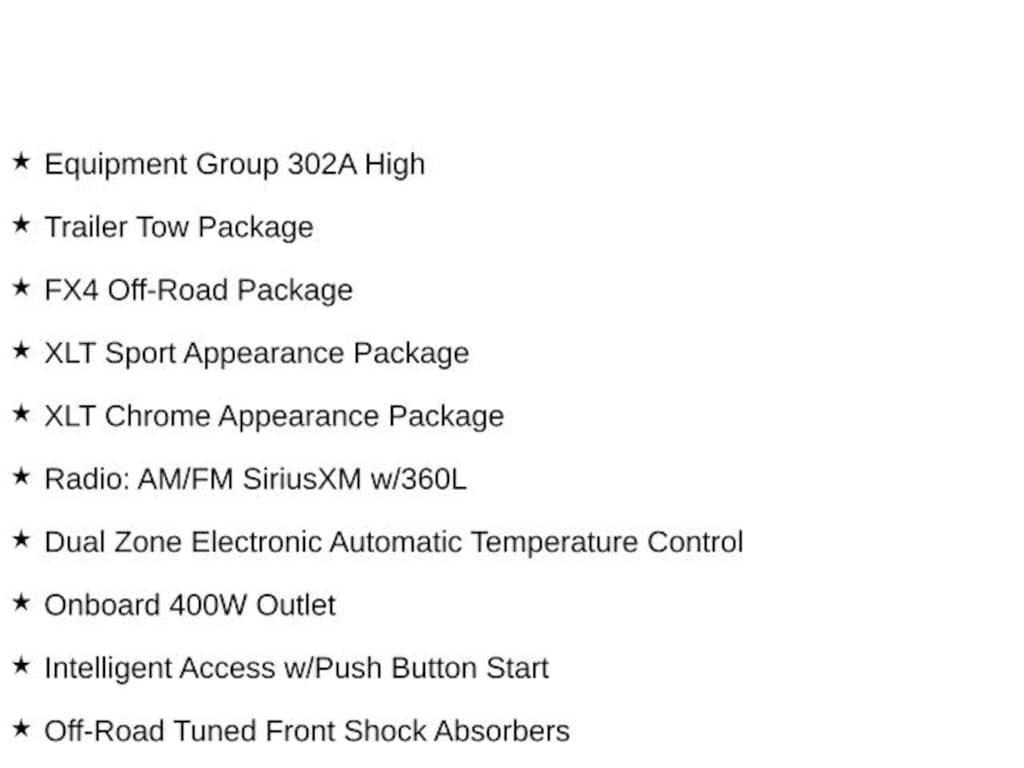 2023 Ford F-150 10-Speed Automatic 4WD, 10-Way Power Driver & Passenger Seats, 2-Bar Style Grille w/Chrome 2 Minor Bars, 4x4 FX4 Off-Road Bodyside Decal, 8" Productivity Screen in Instrument Cluster, Accent-Color Step Bars, Auto-Dimming Rear-View Mirror, Black 2-Bar Style Grille w/Black Surround/Accents, Body-Color Door & Tailgate Handles, Body-Color Front & Rear Bumpers, Box Side Decals, Bright Polished Step Bars, Chrome Door & Tailgate Handles w/Body-Color Bezel, Chrome Single-Tip Exhaust, Class IV Trailer Hitch Receiver, Dual Zone Electronic Automatic Temperature Control, Equipment Group 302A High, FX4 Off-Road Package, Heated Front Seats, Hill Descent Control, Integrated Trailer Brake Controller, Intelligent Access w/Push Button Start, LED Reflector Headlamps, LED Sideview Mirror Spotlights, Monotube Rear Shocks, Off-Road Tuned Front Shock Absorbers, Onboard 400W Outlet, Power Glass Heated Sideview Mirrors, Pro Trailer Backup Assist & Pro Trailer Hitch Assist, Radio: AM/FM SiriusXM w/360L, Rear Under-Seat Storage, Remote Start System w/Remote Tailgate Release, Rock Crawl Mode, SecuriCode Drivers Side Keyless-Entry Keypad, SYNC 4 w/Enhanced Voice Recognition, Trailer Tow Package, Unique Sport Cloth 40/Console/40 Front-Seats, Wheels: 18" 6-Spoke Machined Aluminum, Wheels: 18" Chrome-Like PVD, Wrapped Steering Wheel, XLT Chrome Appearance Package, XLT Sport Appearance Package, Zone Lighting. Clean CARFAX. 3.5L V6 EcoBoost
