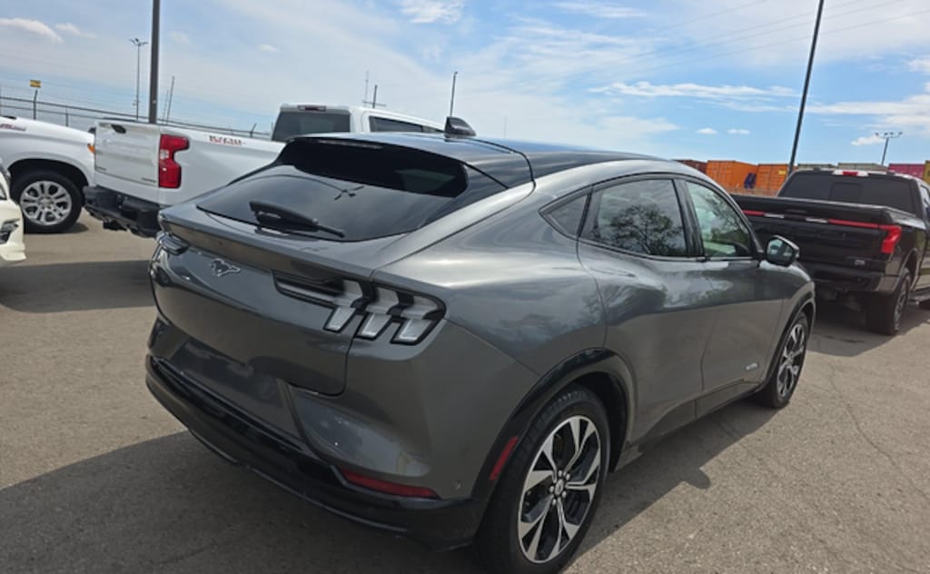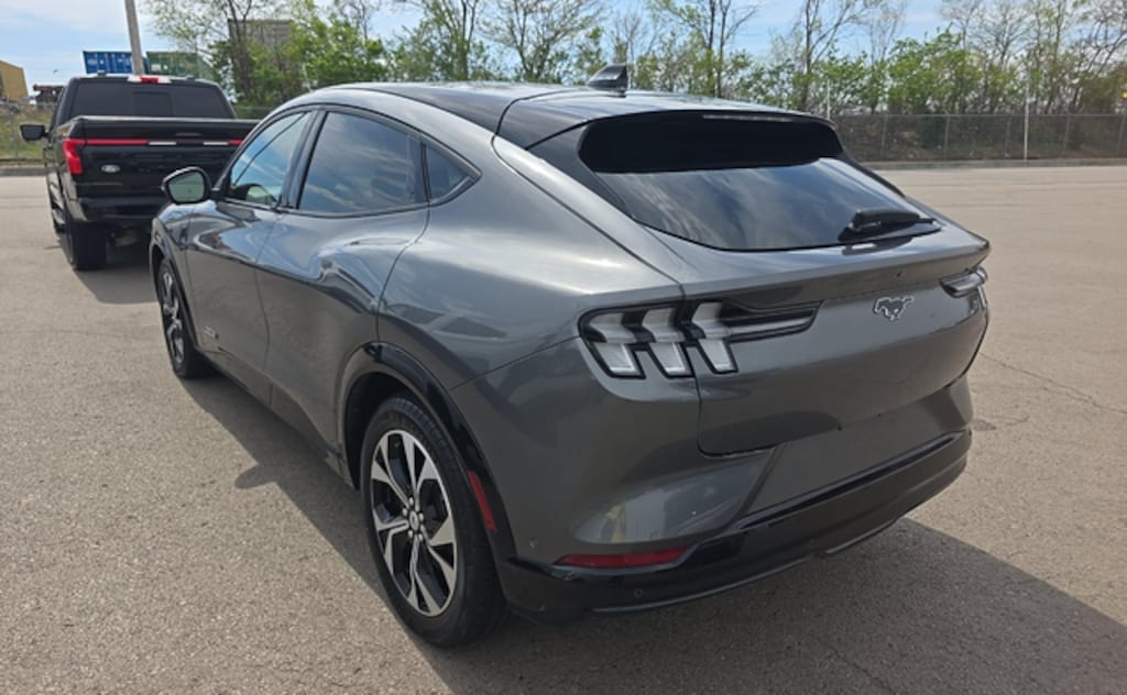 The 2023 Ford Mustang Mach-E Premium makes a bold statement with its sleek lines and dynamic design. Finished in CARBONIZED GRAY METALLIC, this vehicle commands attention wherever it goes. The Body-colored front bumper and Body-colored rear bumper create a seamless look, while the Spoiler adds a touch of sportiness. The Wheels: 19in Machined-Face Aluminum enhance the vehicle's athletic stance. The First-row sunroof First and second-row fixed glass sunroof brings the outside in, and the Active grille shutters improve aerodynamics. The Auto headlights Autolamp auto on/off headlight control and LED daytime running lights provide enhanced visibility.