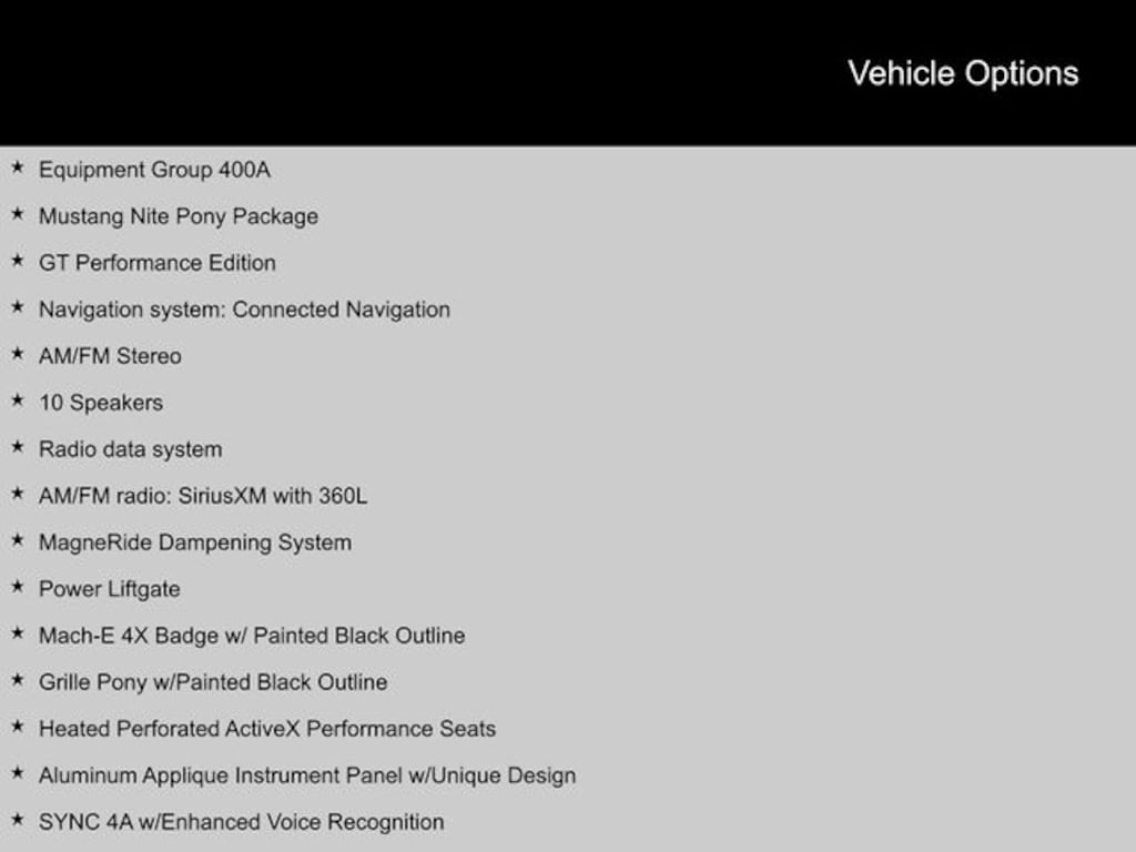 2023 Ford Mustang Mach-E 10 Speakers, Aluminum Applique Instrument Panel w/Unique Design, AM/FM radio: SiriusXM with 360L, AM/FM Stereo, Black Painted Center Wheel Cap, Equipment Group 400A, Grille Pony w/Painted Black Outline, GT Performance Edition, Heated Perforated ActiveX Performance Seats, Mach-E 4X Badge w/ Painted Black Outline, MagneRide Dampening System, Mustang Nite Pony Package, Navigation system: Connected Navigation, Power Liftgate, Radio data system, SYNC 4A w/Enhanced Voice Recognition, Wheels: 20" Hi-Gloss Painted Black, Wheels: 20" x 8" Machined-Face Aluminum. CARFAX One-Owner.