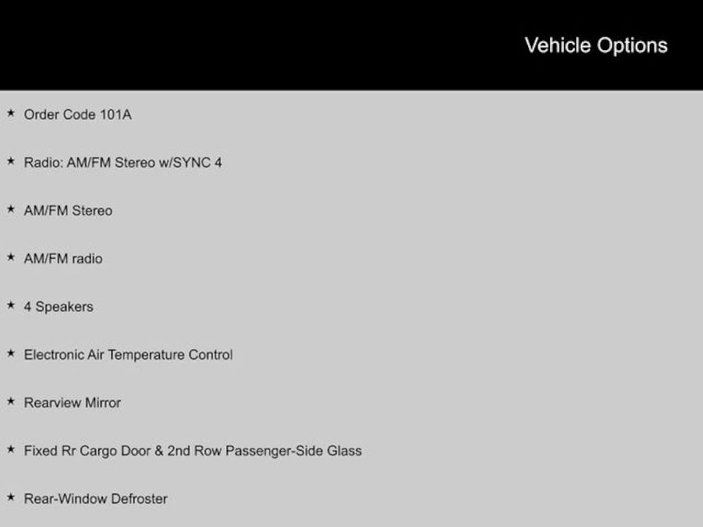 2023 Ford Transit-250 4 Speakers, AM/FM radio, AM/FM Stereo, Electronic Air Temperature Control, Fixed Rr Cargo Door & 2nd Row Passenger-Side Glass, Order Code 101A, Radio: AM/FM Stereo w/SYNC 4, Rear-Window Defroster, Rearview Mirror. Clean CARFAX.