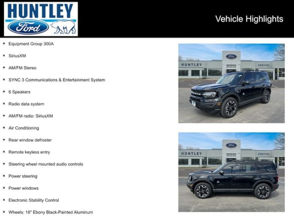 2024 Ford Bronco Sport 6 Speakers, Air Conditioning, Alloy wheels, AM/FM radio: SiriusXM, AM/FM Stereo, Electronic Stability Control, Equipment Group 300A, Power steering, Power windows, Radio data system, Rear window defroster, Remote keyless entry, SiriusXM, Steering wheel mounted audio controls, SYNC 3 Communications & Entertainment System, Wheels: 18" Ebony Black-Painted Aluminum. CARFAX One-Owner.