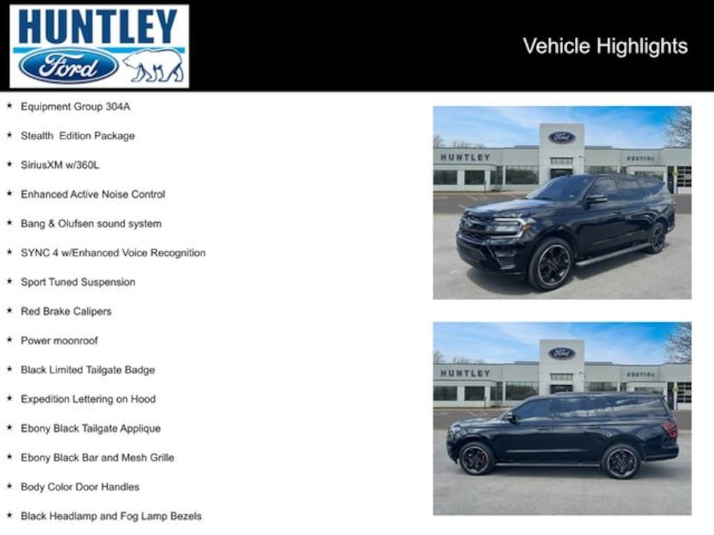 2024 Ford Expedition Max 1st & 2nd Row Floor Mats w/Logo, 3.73 Axle Ratio, Bang & Olufsen sound system, Black Headlamp and Fog Lamp Bezels, Black Limited Tailgate Badge, Black Roof Rack Side Rails, Body Color Door Handles, Dual Exhaust System, Ebony Black Bar and Mesh Grille, Ebony Black Power Deployable Running Boards, Ebony Black Tailgate Applique, Enhanced Active Noise Control, Equipment Group 304A, Expedition Lettering on Hood, Heated/Ventilated Lthr Front Captain's Chairs (A), LED Taillamp w/Black Bezels, Power moonroof, Power-Folding Sideview Mirrors w/Autofold, Red Brake Calipers, SiriusXM w/360L, Sport Center Console, Sport Tuned Suspension, Stealth Edition Package, SYNC 4 w/Enhanced Voice Recognition, Wheels: 22" Premium Black-Painted Aluminum. Clean CARFAX. CARFAX One-Owner.