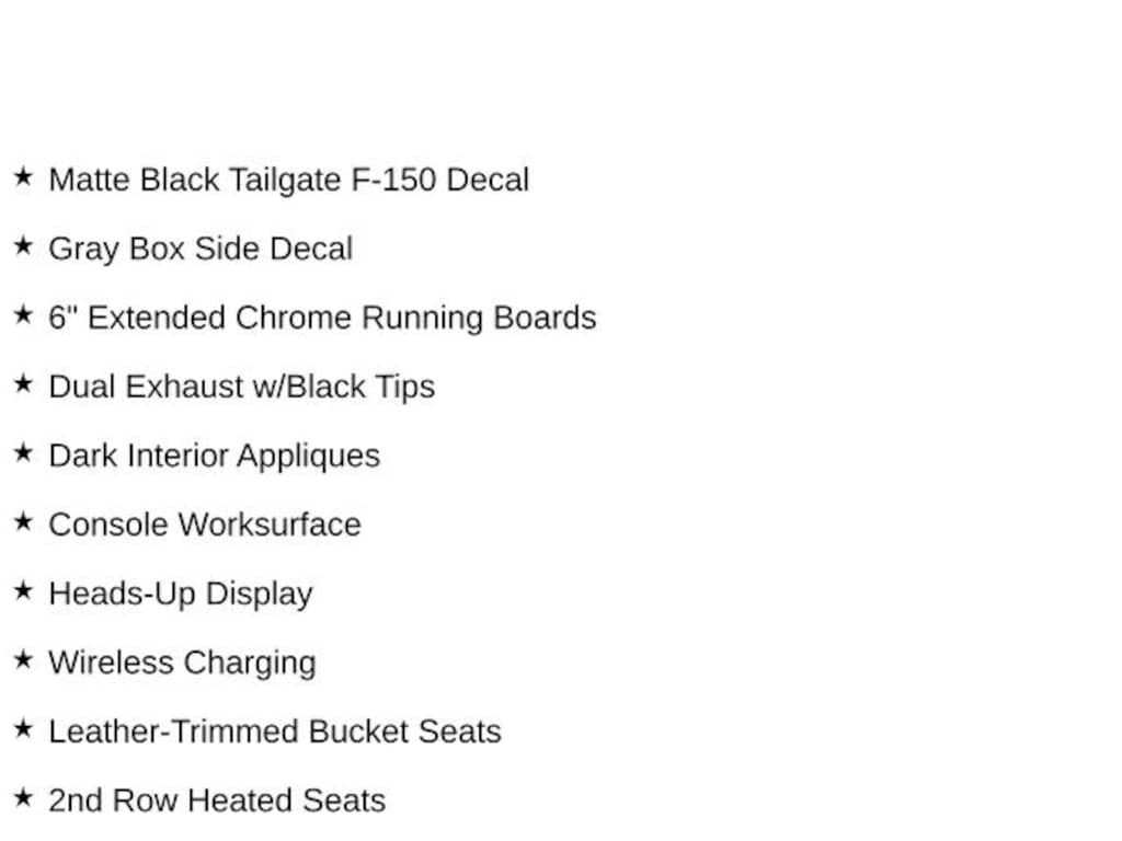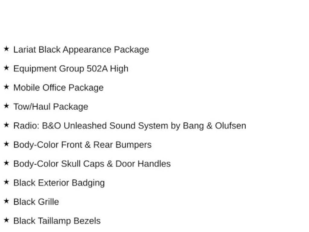 2024 Ford F-150 10-Speed Automatic 3.5L PowerBoost Full-Hybrid V6, 4WD, 2nd Row Heated Seats, 6" Extended Chrome Running Boards, Black Exterior Badging, Black Grille, Black Taillamp Bezels, Body-Color Front & Rear Bumpers, Body-Color Skull Caps & Door Handles, Console Worksurface, Dark Interior Appliques, Dual Exhaust w/Black Tips, Equipment Group 502A High, Gray Box Side Decal, Heads-Up Display, Integrated Trailer Brake Controller, Lariat Black Appearance Package, Leather-Trimmed Bucket Seats, Matte Black Tailgate F-150 Decal, Mobile Office Package, Partitioned Lockable Rear Storage, Radio: B&O Unleashed Sound System by Bang & Olufsen, Tow/Haul Package, Wheels: 20" Gloss Black Painted Aluminum, Wireless Charging. Clean CARFAX. 3.5L PowerBoost Full-Hybrid V6 Odometer is 6506 miles below market average!