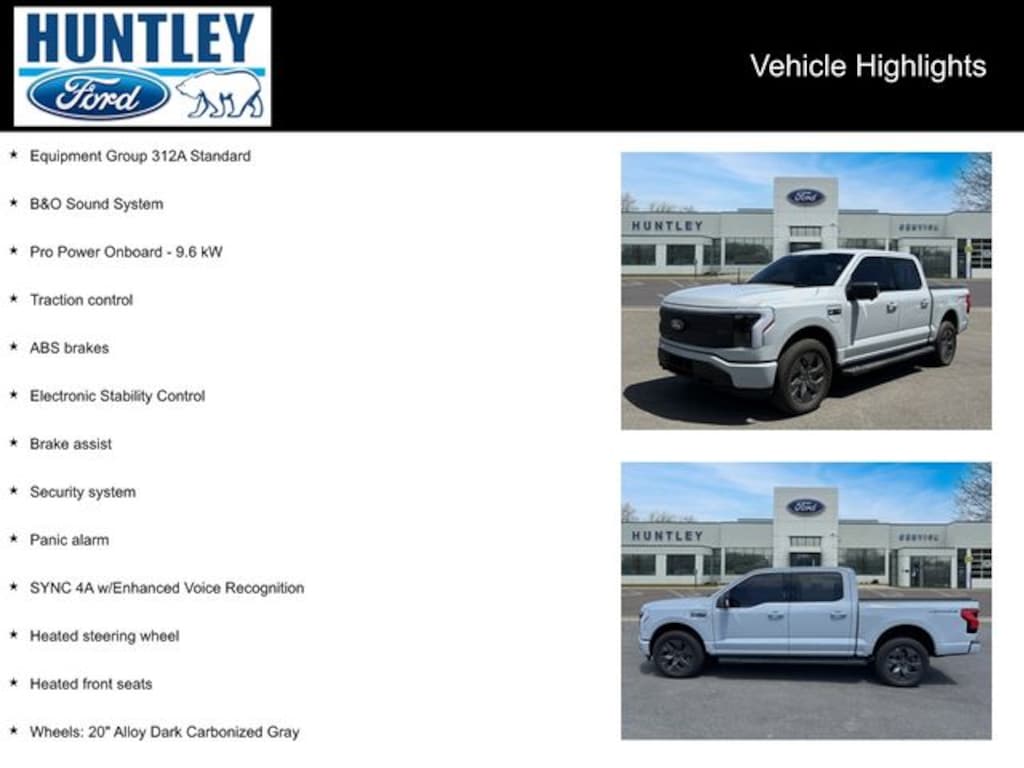 2024 Ford F-150 Lightning ABS brakes, B&O Sound System, Brake assist, Electronic Stability Control, Equipment Group 312A Standard, Heated front seats, Heated steering wheel, Panic alarm, Pro Power Onboard - 9.6 kW, Security system, SYNC 4A w/Enhanced Voice Recognition, Traction control, Wheels: 20" Alloy Dark Carbonized Gray. CARFAX One-Owner.