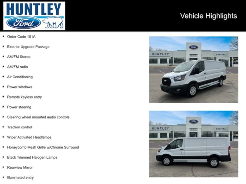 2024 Ford Transit-250 3.73 Axle Ratio, Air Conditioning, AM/FM radio, AM/FM Stereo, Black Trimmed Halogen Lamps, Exterior Upgrade Package, Fixed Rr Cargo Door & 2nd Row Passenger-Side Glass, Honeycomb Mesh Grille w/Chrome Surround, Illuminated entry, Order Code 101A, Power steering, Power windows, Rear-Window Defroster, Rearview Mirror, Remote keyless entry, Steering wheel mounted audio controls, Traction control, Wheels: 16" Steel w/Full Silver Cover, Wiper Activated Headlamps. CARFAX One-Owner.