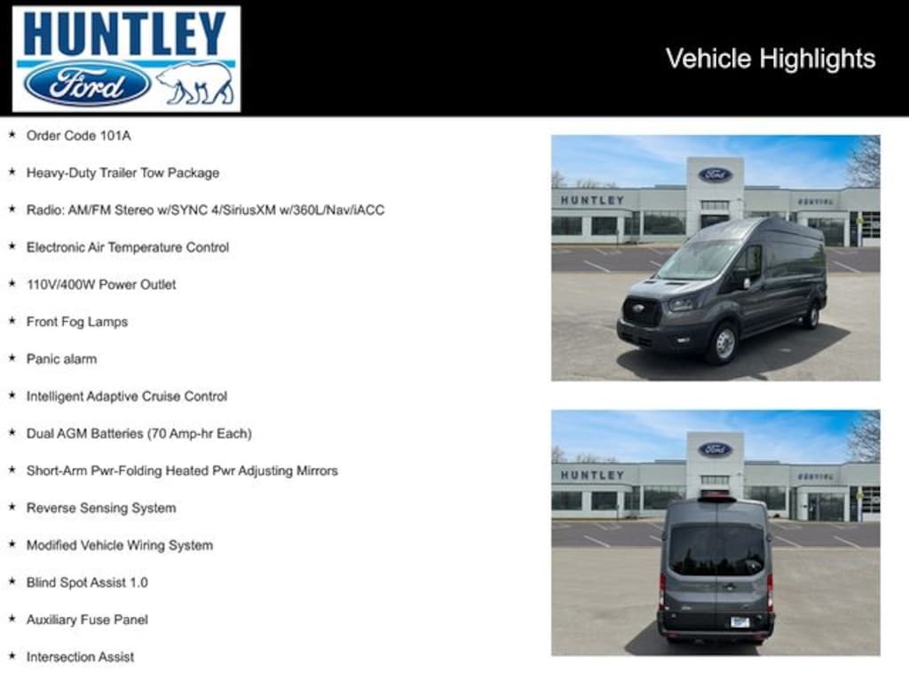 2024 Ford Transit-350 110V/400W Power Outlet, 4.10 Limited-Slip Axle Ratio, Auxiliary Fuse Panel, Blind Spot Assist 1.0, Dual AGM Batteries (70 Amp-hr Each), Electronic Air Temperature Control, Frame Mounted Hitch Receiver, Front Fog Lamps, Heavy-Duty Trailer Tow Package, Intelligent Adaptive Cruise Control, Intelligent Speed Assist (ISA), Intersection Assist, Modified Vehicle Wiring System, Order Code 101A, Panic alarm, Radio: AM/FM Stereo w/SYNC 4/SiriusXM w/360L/Nav/iACC, Reverse Sensing System, Short-Arm Pwr-Folding Heated Pwr Adjusting Mirrors, Tow/Haul Mode w/Trailering Wiring Provisions, Traffic Sign Recognition (TSR). CARFAX One-Owner.