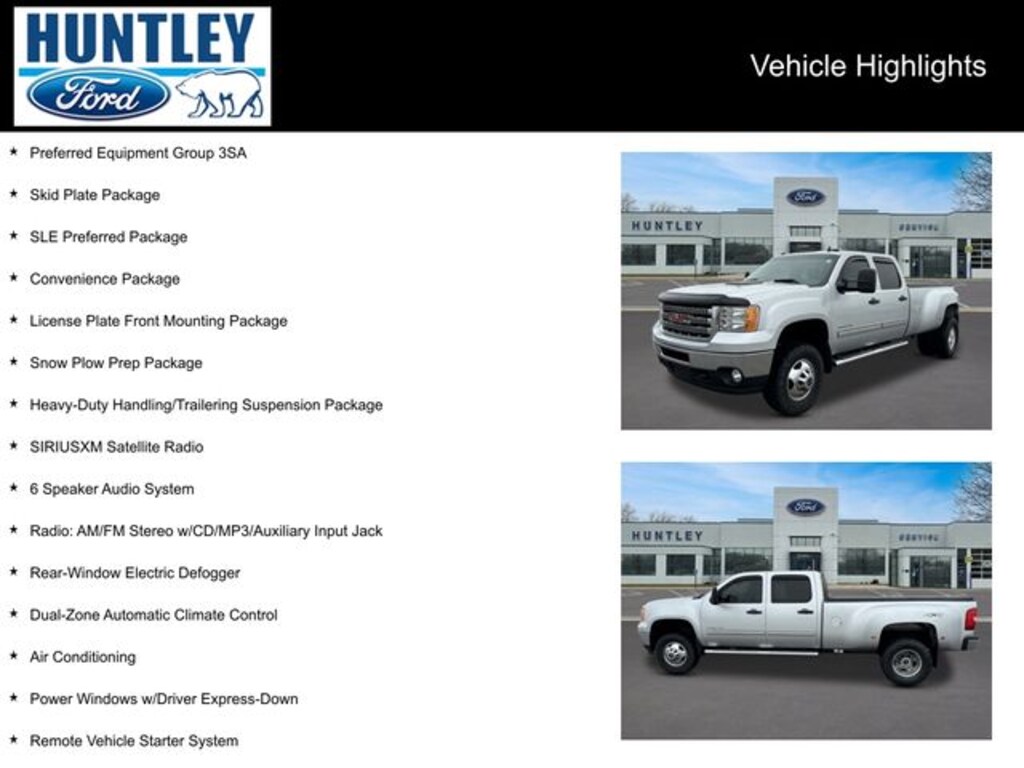 2012 GMC Sierra 3500HD Allison 1000 6-Speed Automatic, 4WD, Ebony Cloth, 6 Speaker Audio System, Air Conditioning, Auto-Dimming Inside Rear-View Mirror, Bluetooth® For Phone, Body-Colored Bodyside Moldings, Chrome Grille w/Chrome Surround, Color-Keyed Carpeting Floor Covering, Convenience Package, Driver & Front Passenger Sliding Visors, Driver-Side Manual Lumbar Control Seat Adjuster, Dual 125-Amp Alternators, Dual-Zone Automatic Climate Control, Electronic Shift Transfer Case, Engine Block Heater, Exhaust Brake, Front Halogen Fog Lamps, Heated Vertical Camper Outside Mirrors, Heavy-Duty Handling/Trailering Suspension Package, Leather-Wrapped Steering Wheel, License Plate Front Mounting Package, Power Door Locks, Power Windows w/Driver Express-Down, Power-Adjustable Pedals For Accelerator & Brake, Preferred Equipment Group 3SA, Provision for Cab Roof-Mounted Lamp/Beacon, Radio: AM/FM Stereo w/CD/MP3/Auxiliary Input Jack, Rear-Window Electric Defogger, Remote Keyless Entry, Remote Vehicle Starter System, SIRIUSXM Satellite Radio, Skid Plate Package, SLE Preferred Package, Snow Plow Prep Package, Solar-Ray Deep-Tinted Glass, Steering Wheel Mounted Audio Controls. Clean CARFAX.