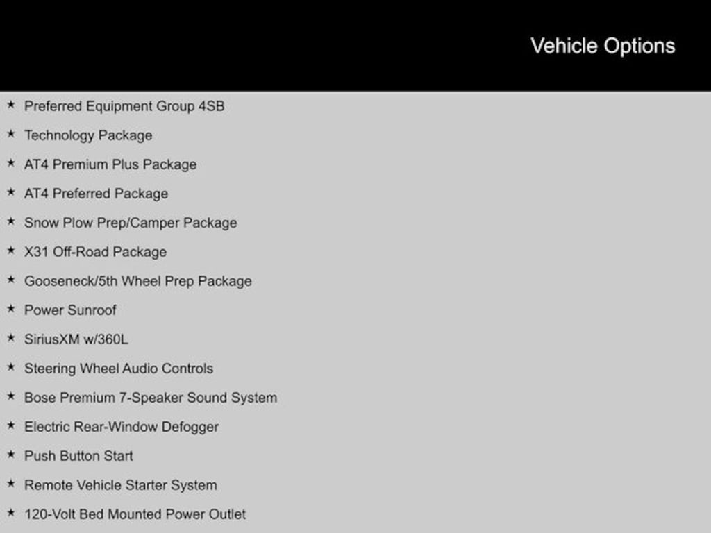 2024 GMC Sierra 2500HD 10-Speed Automatic, 4WD, Jet Black w/Kalahari Accents w/Perforated Leather-Appointed Front Seat Trim, 120-Volt Bed Mounted Power Outlet, 120-Volt Instrument Panel Power Outlet, 2 Charge-Only Rear USB Ports, 2 Charge/Data USB Ports Inside Center Console, 2 USB Ports, 2-Speed Active Transfer Case, 220-Amp Alternator, Adaptive Cruise Control, AT4 Preferred Package, AT4 Premium Plus Package, Bed View Camera w/2 Trailer Camera Provisions, Bose Premium 7-Speaker Sound System, Deep-Tinted Glass, Electric Rear-Window Defogger, Engine Block Heater, Floor-Mounted Center Console, Front Prem Floor Liners w/Removable Carpet Insert, Front Rain-Sensing Wipers, Gloss Black Header Grille & Grille Insert Bars, GMC Connected Access Capable, Gooseneck/5th Wheel Prep Package, HD Surround Vision, Heated 2nd Row Outboard Seats, Heated Driver & Front Outboard Passenger Seats, High Idle Switch, Hill Descent Control, Inside Rearview Auto-Dimming Rear Camera Mirror, Integrated Trailer Brake Controller, Keyless Open & Start, LED Cargo Area Lighting, LED Smoked Amber Roof Marker Lamps, Manual Tilt-Wheel/Telescoping Steering Column, Multicolor 15" Diagonal Head-Up Display, Off-Road High Clearance Step (LPO), OnStar & GMC Connected Services Capable, Power Front Passenger Windows w/Express Up/Down, Power Sliding Rear Window w/Defogger, Power Sunroof, Preferred Equipment Group 4SB, Push Button Start, Rear Cross Traffic Alert, Rear Prem Floor Liners w/Removable Carpet Insert, Rear Wheelhouse Liners, Remote Vehicle Starter System, Safety Alert Seat, SiriusXM w/360L, Snow Plow Prep/Camper Package, Spray-On Bedliner w/AT4 Logo, Steering Wheel Audio Controls, Technology Package, Trailer Cam Provisions & Trailer Viewing Software, Trailer Side Blind Zone Alert, Ultrasonic Front & Rear Park Assist, Unauthorized Entry Theft-Deterrent System, Universal Home Remote, Ventilated Driver & Front Passenger Seats, Wireless Charging, Wireless Phone Projection, X31 Off-Road Package. Clean CARFAX.