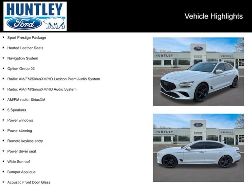 2023 Genesis G70 Heated Leather Seats, 4-Way Power Lumbar Front Passenger Seat, 6 Speakers, Acoustic Front Door Glass, Alloy Pedals, Alloy wheels, AM/FM radio: SiriusXM, Bumper Applique, Dark Chrome Grille & Daylight Opening Trim, Forward & Reverse Parking Distance Warning, Front Passenger Seat Walk-In Device, Integrated Memory System (IMS), Leather Seating Surfaces, Navigation System, Option Group 02, Power driver seat, Power Folding ECM Outside Mirrors, Power steering, Power Telescoping Steering Wheel, Power windows, Radio: AM/FM/SiriusXM/HD Audio System, Radio: AM/FM/SiriusXM/HD Lexicon Prem Audio System, Rain-Sensing Wipers, Remote keyless entry, Sport Aluminum Trim, Sport Prestige Package, Ventilated Front Seats, Wheels: 19" x 8.0J Fr & 19" x 8.5J Rr Sport Alloy, Wide Sunroof, Wireless Device Charging. CARFAX One-Owner.