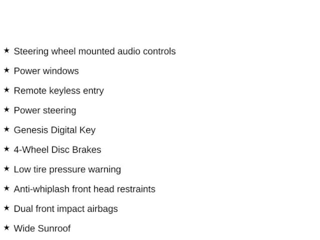 2023 Genesis G70 8-Speed Automatic with SHIFTRONIC 4-Wheel Disc Brakes, 6 Speakers, Acoustic Front Door Glass, Air Conditioning, Alloy Pedals, Alloy wheels, AM/FM radio: SiriusXM, Anti-whiplash front head restraints, Automatic temperature control, Dark Chrome Grille & Daylight Opening Trim, Dual front impact airbags, Forward & Reverse Parking Distance Warning, Genesis Digital Key, Illuminated entry, Low tire pressure warning, Option Group 03, Power driver seat, Power Driver Seat Bolster & Cushion Extension, Power steering, Power windows, Radio: AM/FM/SiriusXM/HD Lexicon Prem Audio System, Remote keyless entry, Sport Advanced Package, Sport Aluminum Trim, Sport Prestige Package, Steering wheel memory, Steering wheel mounted audio controls, Variable Exhaust Valve System, Ventilated Front Seats, Wheels: 19" x 8.0J Fr & 19" x 8.5J Rr Sport Alloy, Wide Sunroof, Wireless Device Charging. CARFAX One-Owner. 17/26 City/Highway MPG 3.3L V6 DGI DOHC 24V Odometer is 1176 miles below market average!