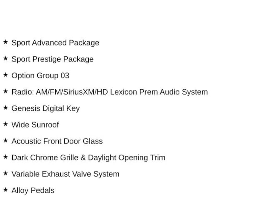 2023 Genesis G70 8-Speed Automatic with SHIFTRONIC Acoustic Front Door Glass, Alloy Pedals, Dark Chrome Grille & Daylight Opening Trim, Forward & Reverse Parking Distance Warning, Genesis Digital Key, Option Group 03, Power Driver Seat Bolster & Cushion Extension, Radio: AM/FM/SiriusXM/HD Lexicon Prem Audio System, Sport Advanced Package, Sport Aluminum Trim, Sport Prestige Package, Variable Exhaust Valve System, Ventilated Front Seats, Wheels: 19" x 8.0J Fr & 19" x 8.5J Rr Sport Alloy, Wide Sunroof, Wireless Device Charging. Clean CARFAX. CARFAX One-Owner. 18/27 City/Highway MPG 3.3L V6 DGI DOHC 24V