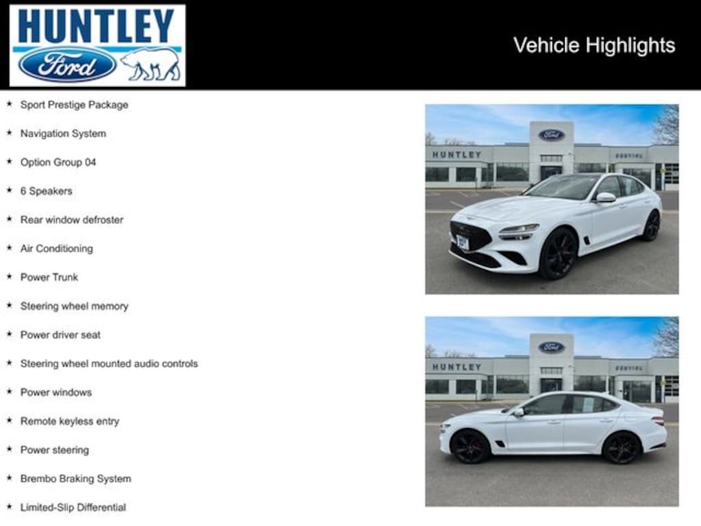 2023 Genesis G70 6 Speakers, Air Conditioning, Alloy wheels, Brembo Braking System, Electronically Controlled Suspension, Heads-Up Display (HUD), Limited-Slip Differential, Microfiber Suede Headliner & Pillars, Nappa Leather Seating Surfaces, Navigation System, Option Group 04, Power driver seat, Power steering, Power Trunk, Power windows, Rear window defroster, Remote keyless entry, Sport Prestige Package, Steering wheel memory, Steering wheel mounted audio controls, Surround View Monitor w/Blind Spot View Monitor, Wheel Locks, Wheels: 19" x 8.0J Fr & 19" x 8.5J Rr Sport Alloy. Clean CARFAX.