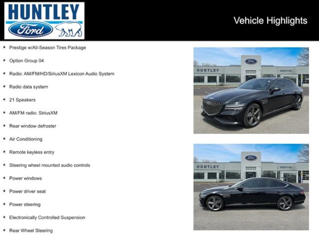 2023 Genesis G80 12.3" 3D Digital Instrument Cluster, 21 Speakers, Air Conditioning, AM/FM radio: SiriusXM, Carbon Fiber Trim, Electronically Controlled Suspension, First Aid Kit, Forward Attention Warning, Heads-Up Display, Microfiber Suede Headliner & Pillars, Nappa Leather Seating Surfaces, Option Group 04, Power driver seat, Power moonroof, Power steering, Power windows, Prestige w/All-Season Tires Package, Radio data system, Radio: AM/FM/HD/SiriusXM Lexicon Audio System, Rear Wheel Steering, Rear window defroster, Remote keyless entry, Remote Smart Parking Assist, Reverse Parking Collision - Avoidance Assist, Steering wheel mounted audio controls, Wheels: 20"x8.5J Fr & 20"x9.5J Rr Sport Alloy. Clean CARFAX. CARFAX One-Owner.