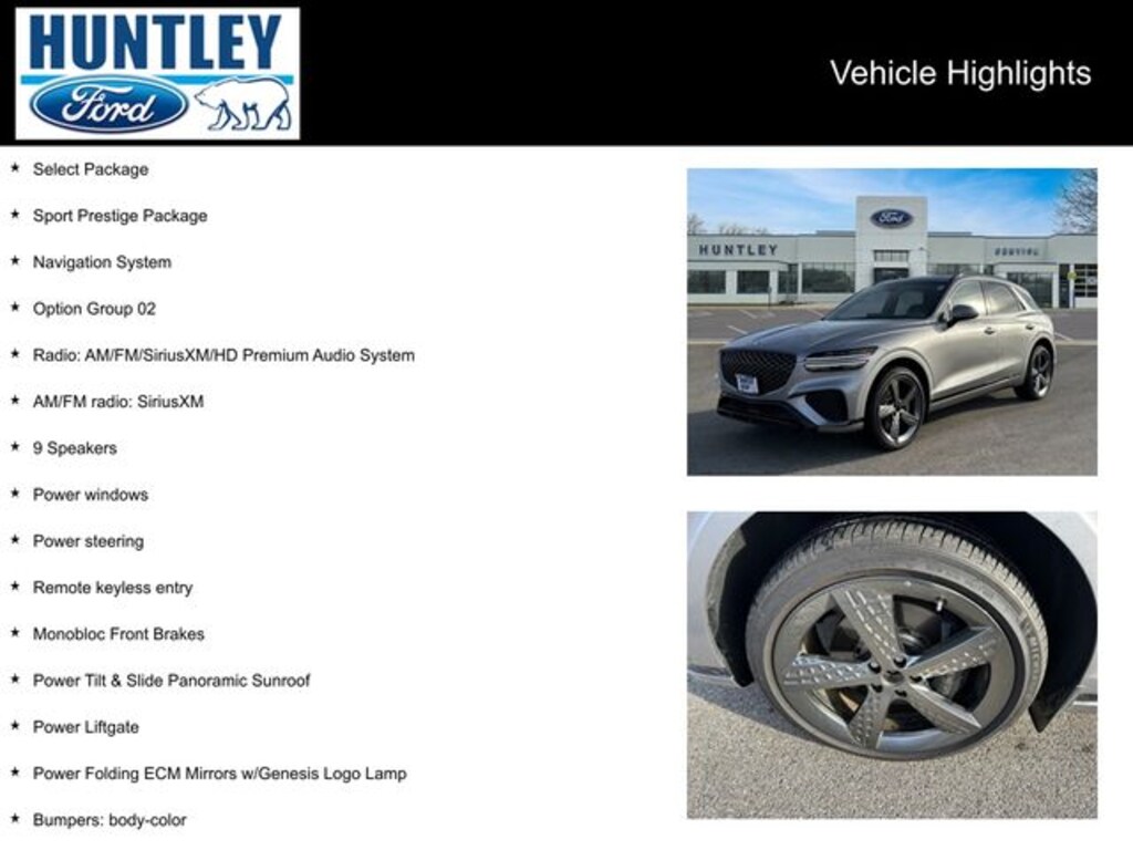 2023 Genesis GV70 9 Speakers, Alloy wheels, AM/FM radio: SiriusXM, Bumpers: body-color, Heated Steering Wheel, Integrated Memory System (IMS), Monobloc Front Brakes, Navigation System, Option Group 02, Power Folding ECM Mirrors w/Genesis Logo Lamp, Power Liftgate, Power steering, Power Telescoping Steering Wheel, Power Tilt & Slide Panoramic Sunroof, Power windows, Radio: AM/FM/SiriusXM/HD Premium Audio System, Remote keyless entry, Select Package, Sport Prestige Package, Ventilated Front Seats, Wheels: 19" Dark Hyper Silver Aluminum.
