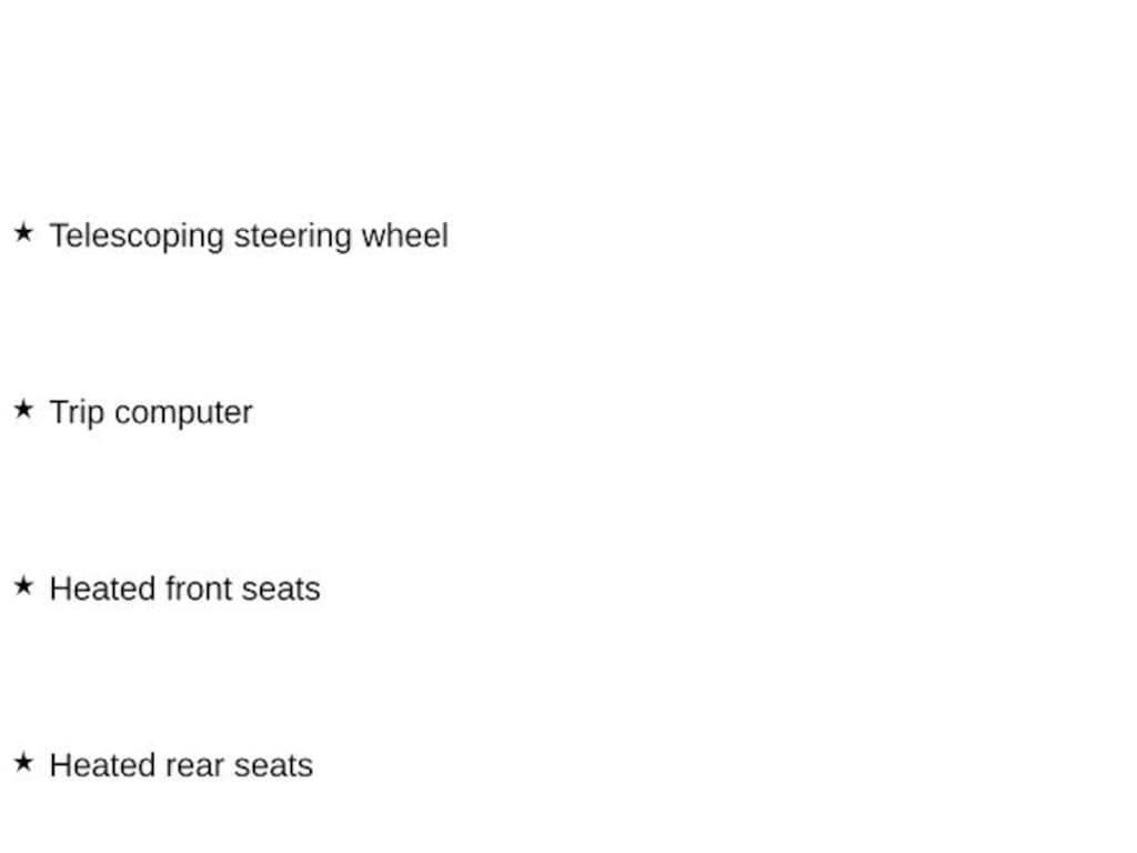 - Adjustable head restraints: driver and passenger, 2nd row w/tilt