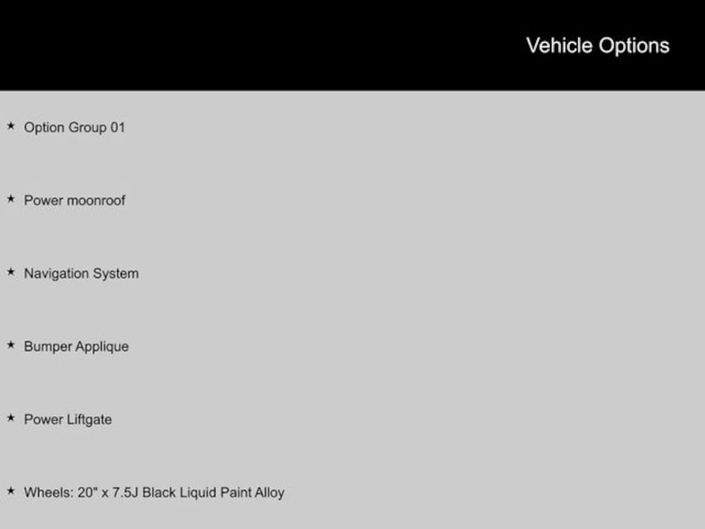 - Wheels: 20" x 7.5J Black Liquid Paint Alloy