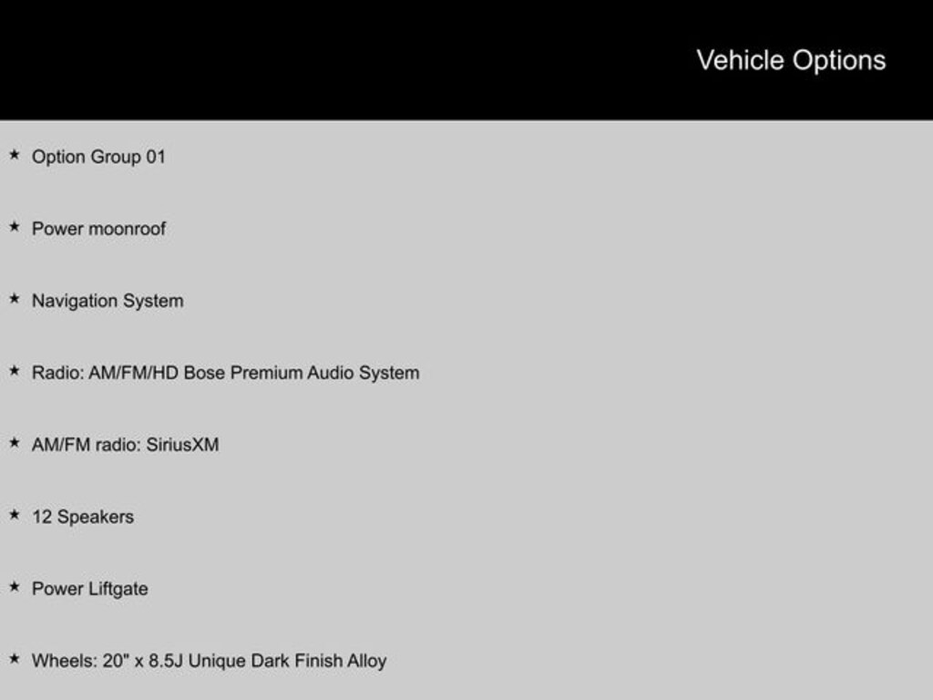 - Wheels: 20" x 8.5J Unique Dark Finish Alloy