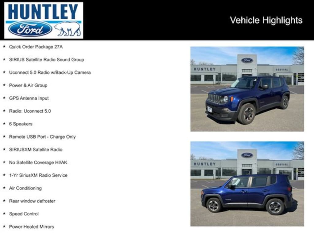2016 Jeep Renegade 1-Yr SiriusXM Radio Service, 5.0" Touchscreen Display, 6 Speakers, Air Conditioning, Exterior Mirrors w/Heating Element, For More Info Call 800-643-2112, GPS Antenna Input, Integrated Voice Command w/Bluetooth, No Satellite Coverage HI/AK, ParkView Rear Back Up-Camera, Power & Air Group, Power Heated Mirrors, Quick Order Package 27A, Radio: Uconnect 5.0, Rear window defroster, Remote USB Port - Charge Only, SIRIUS Satellite Radio Sound Group, SIRIUSXM Satellite Radio, Speed Control, Uconnect 5.0 Radio w/Back-Up Camera.