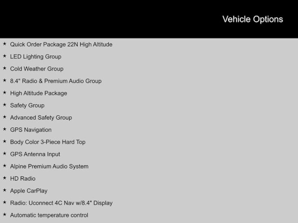 2021 Jeep Wrangler 1-Year SiriusXM Guardian Trial, 3.73 Rear Axle Ratio, 4G LTE Wi-Fi Hot Spot, 5-Year SiriusXM Traffic Service, 5-Year SiriusXM Travel Link Service, 8.4" Radio & Premium Audio Group, 8.4" Touchscreen Display, Advanced Brake Assist, Advanced Safety Group, Air Conditioning, Alpine Premium Audio System, Anti-Lock 4-Wheel FNC Disc Brakes, Apple CarPlay, Auto High Beam Headlamp Control, Auto-Dimming Rear-View Mirror, Automatic temperature control, Blind Spot & Cross Path Detection, Body Color 3-Piece Hard Top, Body Color Door Handles, Body Color Exterior Mirrors, Body Color Front Bumper, Body Color Fuel Filler Door, Body Color Grille w/Gloss Black Rings, Body Color Rear Bumper w/Step Pads, Caramel Interior Accents, Cold Weather Group, Dana M210 Wide HD Tube Front Axle, Dana M220 Wide Rear Axle, Daytime Running Lamps LED Accents, Emergency/Assistance Call, Engine Block Heater, For Details, Visit DriveUconnect.com, For More Info, Call 800-643-2112, Front dual zone A/C, Front LED Fog Lamps, Full Body Color Fender Flares, Full Speed Forward Collision Warning Plus, Google Android Auto, GPS Antenna Input, GPS Navigation, HD Radio, Heated Front Seats, Heated Steering Wheel, High Altitude Package, Integrated Off-Road Camera, Integrated Voice Command w/Bluetooth, Leather Trimmed Bucket Seats (KL), Leather Wrapped Park Brake Handle, Leather Wrapped Shift Knob, LED Lighting Group, LED Premium Reflector Headlamps, LED Taillamps, MOPAR Hardtop Headliner, Off-Road Info Pages, ParkSense Rear Park Assist System, Power steering, Premium Dark Exterior Accents, Quick Order Package 22N High Altitude, Radio: Uconnect 4C Nav w/8.4" Display, Remote Proximity Keyless Entry, Safety Group, SiriusXM Traffic Plus, SiriusXM Travel Link, Sport Suspension, Summit Badging, USB Host Flip, Wheels: 20" x 8" Fully Painted Aluminum, Wrapped I/P Bezel w/Caramel Stitch. Clean CARFAX.