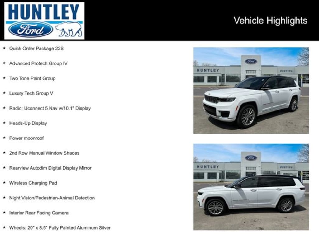 2022 Jeep Grand Cherokee L 2nd Row Manual Window Shades, Advanced Protech Group IV, Heads-Up Display, Interior Rear Facing Camera, Luxury Tech Group V, Night Vision/Pedestrian-Animal Detection, Power moonroof, Quick Order Package 22S, Radio: Uconnect 5 Nav w/10.1" Display, Rearview Autodim Digital Display Mirror, Two Tone Paint Group, Wheels: 20" x 8.5" Fully Painted Aluminum Silver, Wireless Charging Pad. Clean CARFAX. CARFAX One-Owner.