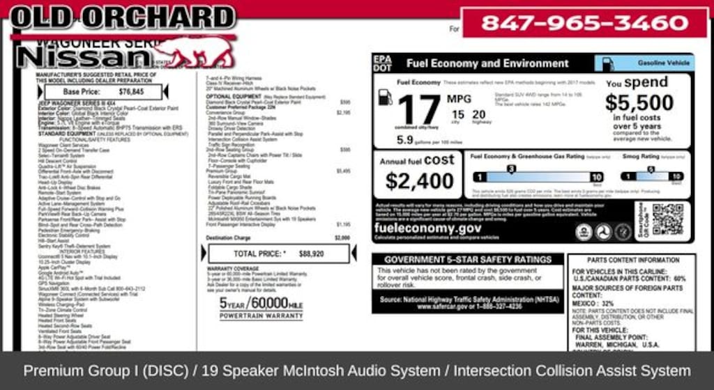 2022 Jeep Wagoneer 8-Speed Automatic 19 Speaker McIntosh Audio System, 2nd Row Manual Window Shades, 3 Panel Sunroof, 7-Passenger Seating, Adjustable Roof Rail Crossbars, Cargo Cover, Convenience Group I, Drowsy Driver Detection, Flexible Seating Group, Floor Console w/Cupholder, Intersection Collision Assist System, Luxury Front & Rear Floor Mats, P&P Park & Unpark Assist w/Stop System, Power Deployable Running Boards, Power Tip/Slide Recline 2nd Row Buckets, Premium Group I (DISC), Quick Order Package 22N, Reversible Carpet/Vinyl Cargo Mat, Surround View Camera System, Traffic Sign Recognition. CARFAX One-Owner. 5.7L V8 Odometer is 5210 miles below market average!