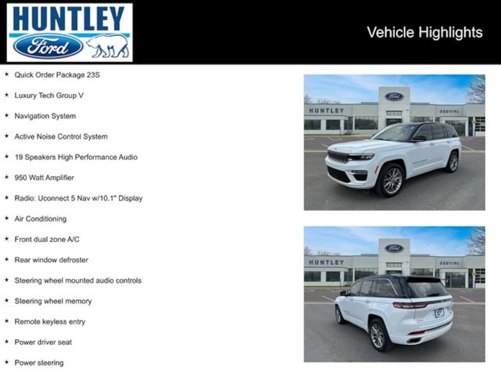 2023 Jeep Grand Cherokee 4WD, 19 Speakers High Performance Audio, 2nd-Row Manual Window Shades, 950 Watt Amplifier, Active Noise Control System, Air Conditioning, Front dual zone A/C, Luxury Tech Group V, Memory seat, Navigation System, Power driver seat, Power Liftgate, Power moonroof, Power steering, Power windows, Quick Order Package 23S, Radio: Uconnect 5 Nav w/10.1" Display, Rear window defroster, Remote keyless entry, Steering wheel memory, Steering wheel mounted audio controls, Wheels: 20" x 8.5" Fully Painted Aluminum Silver, Wireless Charging Pad. Clean CARFAX. CARFAX One-Owner.