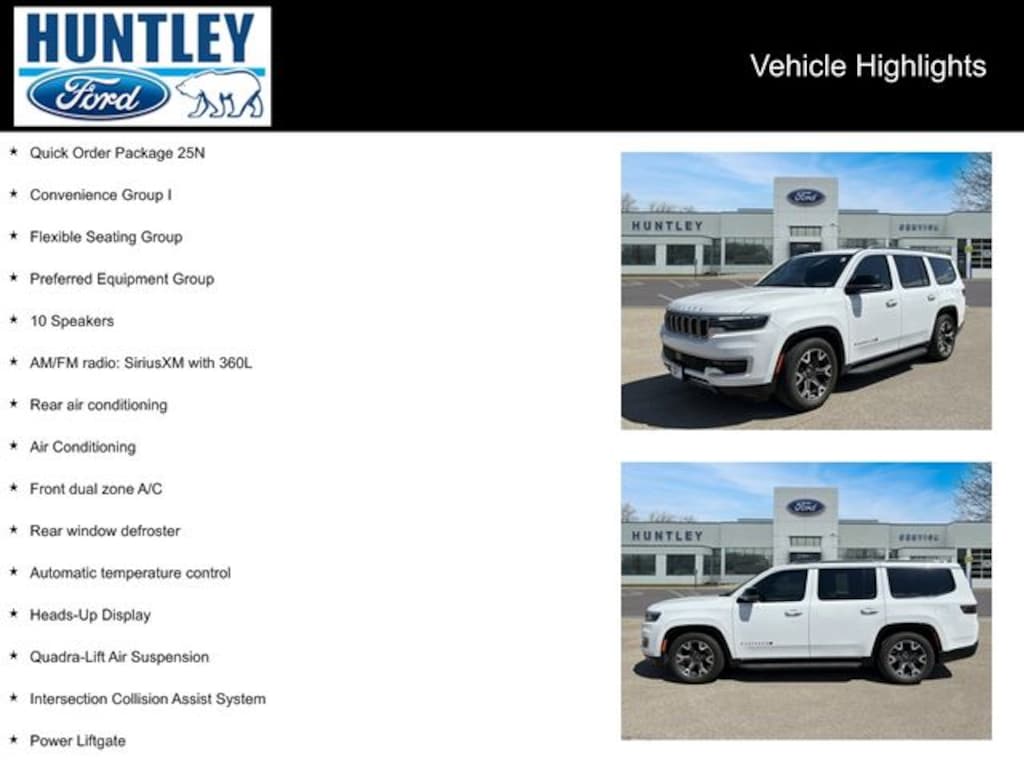 2023 Jeep Wagoneer 10 Speakers, 20" x 9.0" Aluminum Wheels, 2nd Row Manual Window Shades, 60/40 Power Recline 3rd Row Seat, 7-Passenger Seating, Air Conditioning, AM/FM radio: SiriusXM with 360L, Automatic temperature control, Convenience Group I, Drowsy Driver Detection, Flexible Seating Group, Floor Console w/Cupholder, Front dual zone A/C, Front Passenger Interactive Display, Heads-Up Display, Intersection Collision Assist System, P&P Park & Unpark Assist w/Stop System, Power Liftgate, Power Tip/Slide Recline 2nd Row Buckets, Preferred Equipment Group, Quadra-Lift Air Suspension, Quick Order Package 25N, Rear air conditioning, Rear window defroster, Semi Active Damping, Side Distance Warning, Surround View Camera System, Traffic Sign Recognition.
