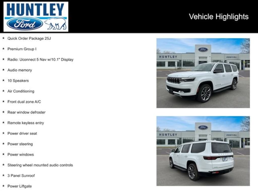 2023 Jeep Wagoneer 10 Speakers, 3 Panel Sunroof, Adjustable Roof Rail Crossbars, Air Conditioning, Audio memory, Cargo Cover, Front dual zone A/C, Front Passenger Interactive Display, Power driver seat, Power Liftgate, Power steering, Power windows, Premium Group I, Quick Order Package 25J, Radio: Uconnect 5 Nav w/10.1" Display, Rear window defroster, Remote keyless entry, Reversible Carpet/Vinyl Cargo Mat, Steering wheel mounted audio controls, Wheels: 20" x 9.0" Premium 2 Aluminum. CARFAX One-Owner.
