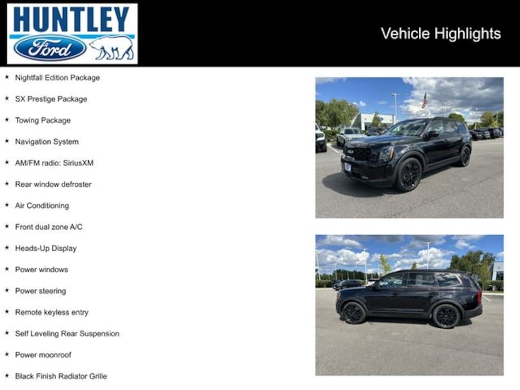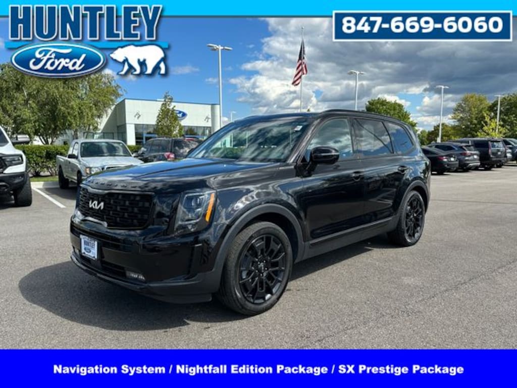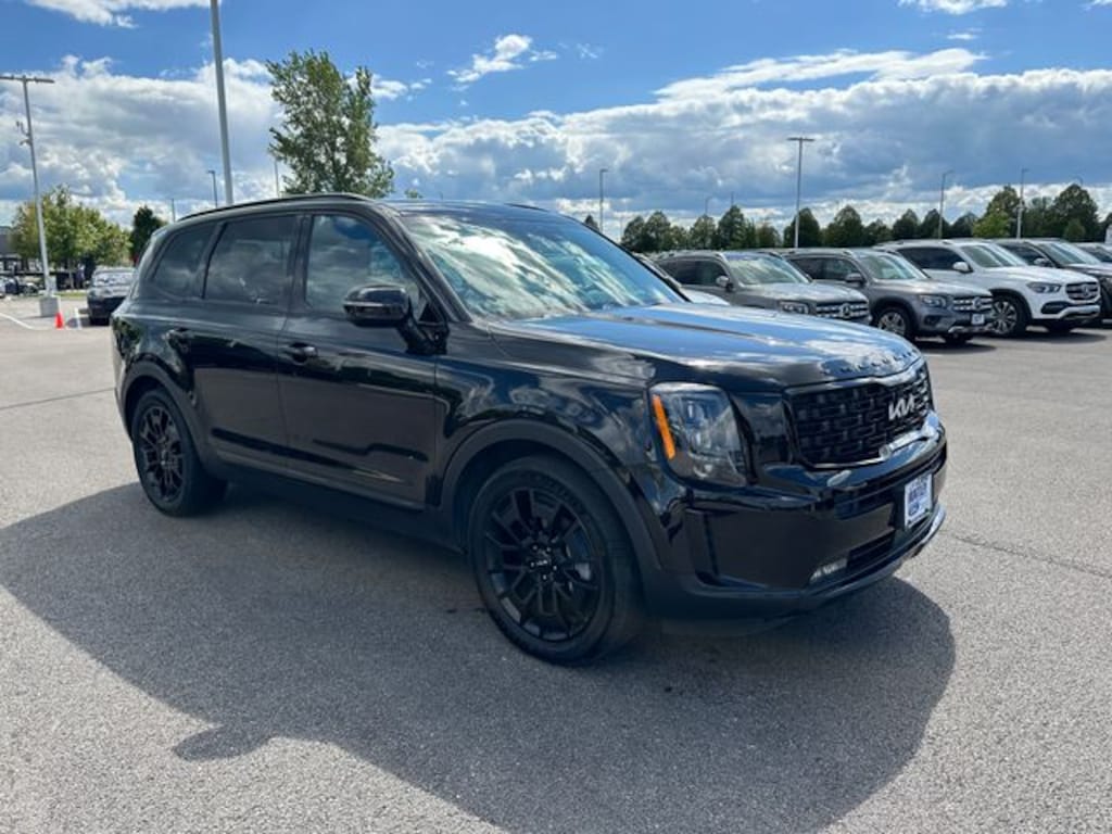 2022 Kia Telluride 110V Inverter, Air Conditioning, AM/FM radio: SiriusXM, Black Finish Radiator Grille, Body Color Exterior Door Handles, Exclusive Black Fog Light Bezel, Exclusive Black Headlight Bezels, Front & Rear Gloss Black Finish Bumper Skid Plates, Front dual zone A/C, Gloss Black Finish Exterior Emblems, Gloss Black Finish Front & Rear Door Garnish, Gloss Black Finish Roof Rails, Heads-Up Display, Heated & Ventilated 2nd Row Seats, Navigation System, Nightfall Edition Package, Power moonroof, Power steering, Power windows, Premium Cloth Headliner & Pillar Trim, Premium Nappa Leather Seat Trim, Rain-Sensing Front Windshield Wipers, Rear window defroster, Remote keyless entry, Self Leveling Rear Suspension, SX Prestige Package, Tow Hitch w/Harness (TOF), Towing Package, Wheels: 20" x 7.5" Exclusive Black Alloy. CARFAX One-Owner.