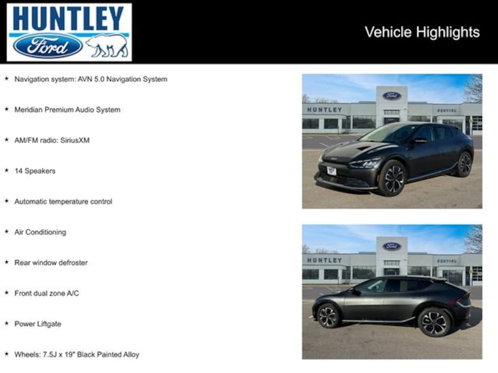 2023 Kia EV6 14 Speakers, Air Conditioning, AM/FM radio: SiriusXM, Automatic temperature control, Front dual zone A/C, Meridian Premium Audio System, Navigation system: AVN 5.0 Navigation System, Power Liftgate, Rear window defroster, Wheels: 7.5J x 19" Black Painted Alloy. CARFAX One-Owner.