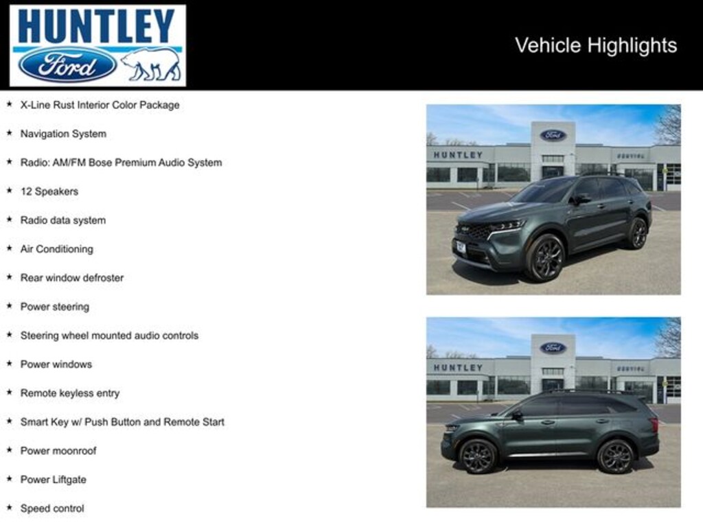 2023 Kia Sorento AWD, 12 Speakers, Air Conditioning, Alloy wheels, Navigation System, Power Liftgate, Power moonroof, Power steering, Power windows, Radio data system, Radio: AM/FM Bose Premium Audio System, Rain sensing wipers, Rear window defroster, Rear window wiper, Remote keyless entry, Smart Key w/ Push Button and Remote Start, Speed control, Steering wheel mounted audio controls, Variably intermittent wipers, Wheels: 8.5J x 20" Matte Gray Alloy, X-Line Rust Interior Color Package. Clean CARFAX. CARFAX One-Owner.