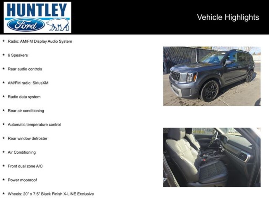 2023 Kia Telluride 6 Speakers, Air Conditioning, AM/FM radio: SiriusXM, Automatic temperature control, Front dual zone A/C, Power moonroof, Radio data system, Radio: AM/FM Display Audio System, Rear air conditioning, Rear audio controls, Rear window defroster, Wheels: 20" x 7.5" Black Finish X-LINE Exclusive. CARFAX One-Owner.