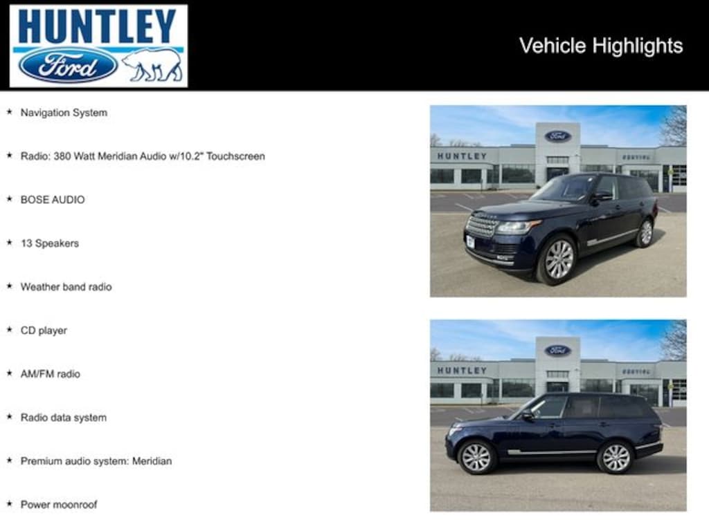 2017 Land Rover Range Rover Leather, 13 Speakers, AM/FM radio, BOSE AUDIO, CD player, Navigation System, Power moonroof, Premium audio system: Meridian, Radio data system, Radio: 380 Watt Meridian Audio w/10.2" Touchscreen, Weather band radio.
