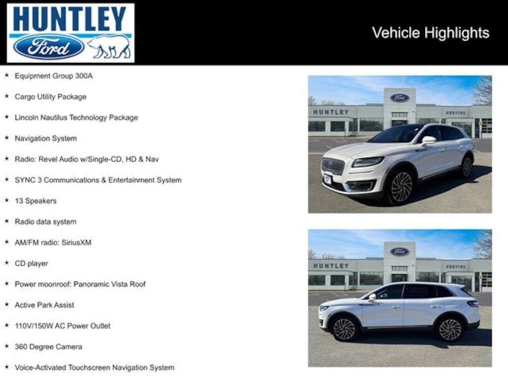 2019 Lincoln Nautilus 110V/150W AC Power Outlet, 13 Speakers, 360 Degree Camera, Active Park Assist, AM/FM radio: SiriusXM, Cargo Compartment w/Reversible Mat, Cargo Utility Package, CD player, Equipment Group 300A, Front Park Aid Sensors, Interior Cargo Cover, Lincoln Nautilus Technology Package, Molded Plastic Storage Bins, Navigation System, Power moonroof: Panoramic Vista Roof, Radio data system, Radio: Revel Audio w/Single-CD, HD & Nav, Rear Cargo Management System, SYNC 3 Communications & Entertainment System, Voice-Activated Touchscreen Navigation System, Wheels: 20" Prem Painted Bright Machined Alum. Clean CARFAX.