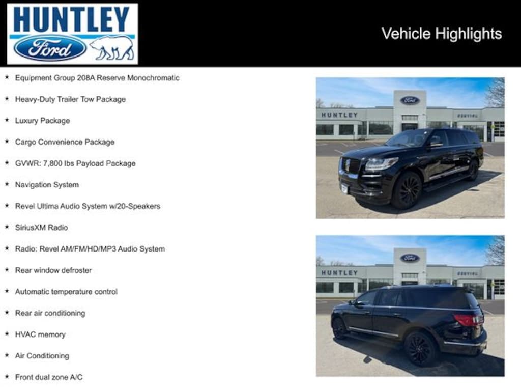2021 Lincoln Navigator L 3.73 Axle Ratio, Air Conditioning, Automatic temperature control, Cargo Convenience Package, Chrome Roof Rack w/Black Crossbars, Class IV w/4-Pin & 7-Pin Connectors, Equipment Group 208A Reserve Monochromatic, Front dual zone A/C, GVWR: 7,800 lbs Payload Package, Heavy-Duty Radiator, Heavy-Duty Trailer Tow Package, HVAC memory, Luxury Package, Memory seat, Navigation System, Pedal memory, Perfect Position Seats (30-Way) w/Active Motion, Power driver seat, Power Liftgate, Power moonroof: Panoramic Vista Roof, Power steering, Power windows, Pro-Trailer Backup Assist, Radio: Revel AM/FM/HD/MP3 Audio System, Rear air conditioning, Rear window defroster, Remote keyless entry, Revel Ultima Audio System w/20-Speakers, SiriusXM Radio, Smart Trailer Tow, Steering wheel memory, Steering wheel mounted audio controls, SYNC 3 Communications & Entertainment System, Trailer Brake Controller, Trailer Sway Control, Voice-Activated Touchscreen Navigation System.