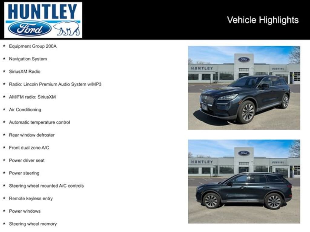 2022 Lincoln Corsair Air Conditioning, AM/FM radio: SiriusXM, Automatic temperature control, Equipment Group 200A, Front dual zone A/C, Heated front seats, Heated Rear Seat, Memory seat, Navigation System, Panoramic Vista Roof w/Power Sunshade, Power driver seat, Power steering, Power windows, Radio: Lincoln Premium Audio System w/MP3, Rear window defroster, Remote keyless entry, SiriusXM Radio, Steering wheel memory, Steering wheel mounted A/C controls, Steering wheel mounted audio controls, SYNC 3 Communications & Entertainment System.