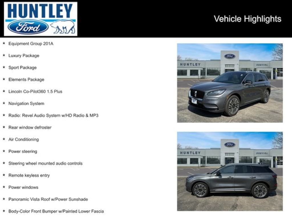 2022 Lincoln Corsair 360-Degree Camera w/Front & Rear Camera Washer, Active Park Assist 2.0, Air Conditioning, Body-Color Front Bumper w/Painted Lower Fascia, Body-Color Plastic Rear Bumper, Elements Package, Equipment Group 201A, Evasive Steering Assist (ESA), Front/Side/Rear Parking Sensors, Heads-Up Display, Heated Rear Seat, Heated Steering Wheel, Heated/Ventilated Driver & Front Passenger Seats, Illuminated Front Scuff Plates, Intelligent Adaptive Cruise Control, Lincoln Co-Pilot360 1.5 Plus, Luxury Package, Navigation System, Panoramic Vista Roof w/Power Sunshade, Power steering, Power windows, Radio: Revel Audio System w/HD Radio & MP3, Rain Sensing Wipers, Rear window defroster, Remote keyless entry, Reverse Brake Assist, Sport Package, Steering wheel mounted audio controls, Unique Lincoln Design Body-Color Mesh Upper Grille, Wheels: 20" Bright Machined Aluminum, Windshield Wiper De-Icer.