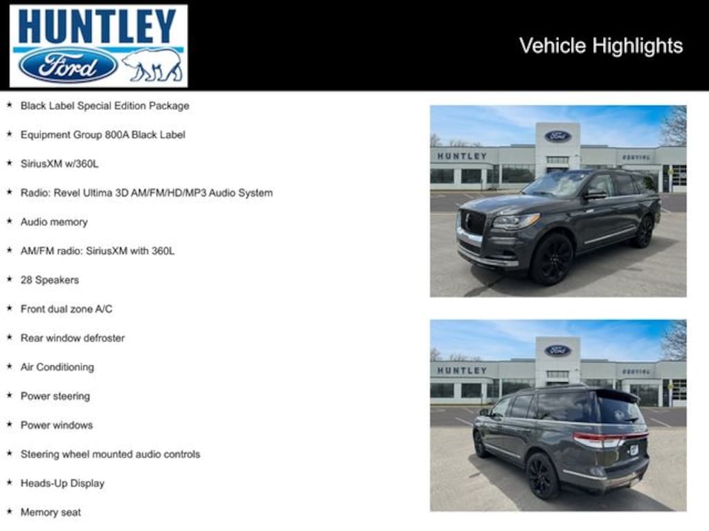 2022 Lincoln Navigator 4WD, Alpine W/Black Stitch Leather, 28 Speakers, 2nd Row Htd/Vent Enhanced Massage Seats w/Console, Air Conditioning, AM/FM radio: SiriusXM with 360L, Audio memory, Black Label Special Edition Package, Black Painted Cap Sideview Mirror, Black Painted Roof, Black Painted Roof Rack, Equipment Group 800A Black Label, Front dual zone A/C, Heads-Up Display, Lincoln Play, Lincoln Star Hub Wheel Ornament, Memory seat, Power moonroof: Panoramic Vista Roof, Power steering, Power windows, Radio: Revel Ultima 3D AM/FM/HD/MP3 Audio System, Rear window defroster, Remote keyless entry, SiriusXM w/360L, Steering wheel mounted audio controls, SYNC 4 Communications & Entertainment System, Unique Chrome Surround Grille, Voice-Activated Touchscreen Navigation System, Wheels: 22" Black Aluminum. CARFAX One-Owner.
