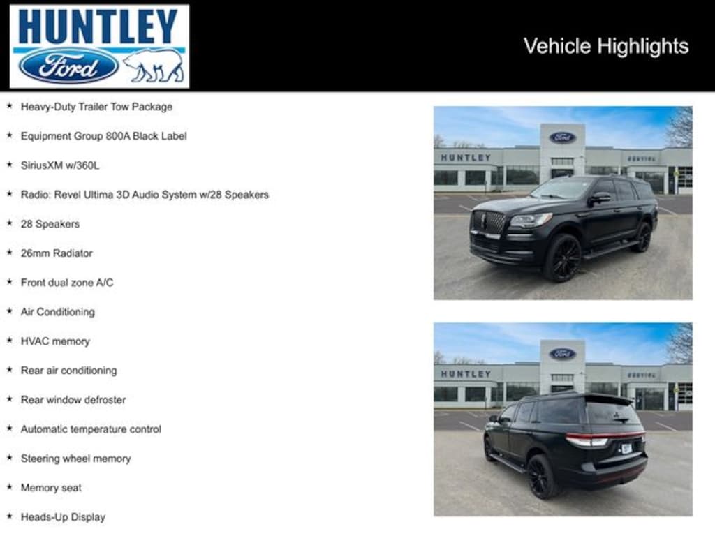 2023 Lincoln Navigator 4WD, Blk Onyx W/Brandy Stitch Leather, 26mm Radiator, 28 Speakers, Air Conditioning, Automatic temperature control, Class IV w/4-Pin & 7-Pin Connectors, Electronic Traction Assist (eLSD), Equipment Group 800A Black Label, Front dual zone A/C, Front Tow Hooks, Heads-Up Display, Heavy-Duty Trailer Tow Package, HVAC memory, Memory seat, Pedal memory, Power Liftgate, Power moonroof: Panoramic Vista Roof, Power steering, Power windows, Pro-Trailer Backup Assist 2.0, Radio: Revel Ultima 3D Audio System w/28 Speakers, Rear air conditioning, Rear window defroster, Remote keyless entry, SiriusXM w/360L, Smart Trailer Tow, Steering wheel memory, Steering wheel mounted audio controls, SYNC 4 Communications & Entertainment System, Tiered Cargo Area Management System, Trailer Brake Controller, Trailer Sway Control, Voice-Activated Touchscreen Navigation System, Wheels: 22" 14-Spoke Bright Machined Aluminum. CARFAX One-Owner.