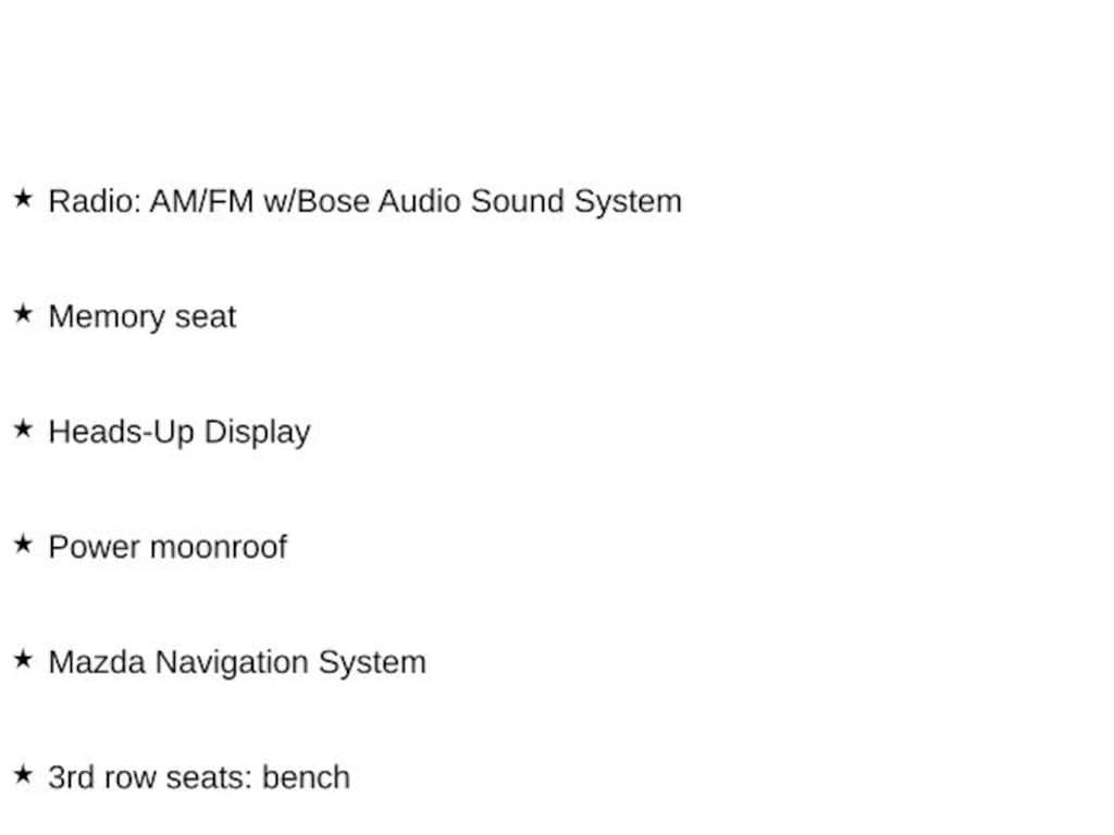 2024 Mazda CX-90 8-Speed Automatic 3rd row seats: bench, Heads-Up Display, Mazda Navigation System, Memory seat, Power moonroof, Radio: AM/FM w/Bose Audio Sound System. CARFAX One-Owner. 24/28 City/Highway MPG I6 Turbo