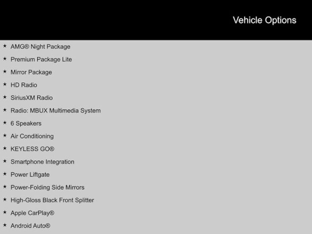 2022 Mercedes-Benz GLA 10.25" Media Display w/Touchscreen, 6 Speakers, Air Conditioning, AMG® Night Package, Android Auto®, Apple CarPlay®, Auto-Dimming Rearview & Driver-Side Mirrors, HD Radio, High-Gloss Black Front Splitter, KEYLESS GO®, MBUX Voice Control, Mirror Package, Power Liftgate, Power-Folding Side Mirrors, Premium Package Lite, Radio: MBUX Multimedia System, SiriusXM Radio, Smartphone Integration, Wheels: 19" AMG® 10-Spoke Matte Black. CARFAX One-Owner.