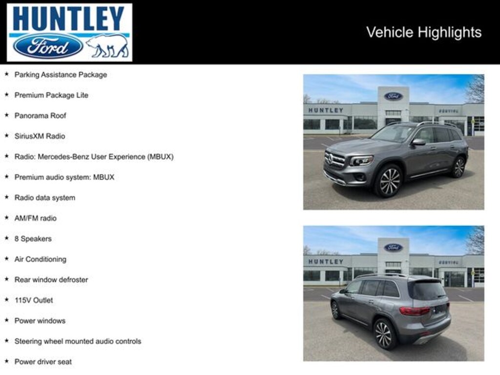 2022 Mercedes-Benz GLB 10.25" Digital Instrument Cluster, 10.25" Media Display w/Touchscreen, 115V Outlet, 8 Speakers, Active Parking Assist, Air Conditioning, AM/FM radio, Auto-Dimming Rearview & Driver-Side Mirrors, KEYLESS GO®, Panorama Roof, Parking Assistance Package, Power driver seat, Power Folding Side Mirrors, Power Liftgate, Power steering, Power windows, Premium audio system: MBUX, Premium Package Lite, Radio data system, Radio: Mercedes-Benz User Experience (MBUX), Rear window defroster, Remote keyless entry, SiriusXM Radio, Smartphone Integration, Steering wheel mounted audio controls, Surround View System, Wheels: 7.5J x 19" 10-Spoke w/Matte Black Accents.