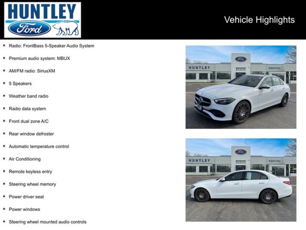 2025 Mercedes-Benz C-Class 4MATIC®, 11.9" Center Touchscreen Display, 18" 5-Spoke Wheels, 5 Speakers, Air Conditioning, AM/FM radio: SiriusXM, Automatic temperature control, Front dual zone A/C, Power driver seat, Power moonroof, Power steering, Power windows, Premium audio system: MBUX, Radio data system, Radio: FrontBass 5-Speaker Audio System, Rear window defroster, Remote keyless entry, Steering wheel memory, Steering wheel mounted audio controls, Weather band radio. Clean CARFAX. CARFAX One-Owner.
