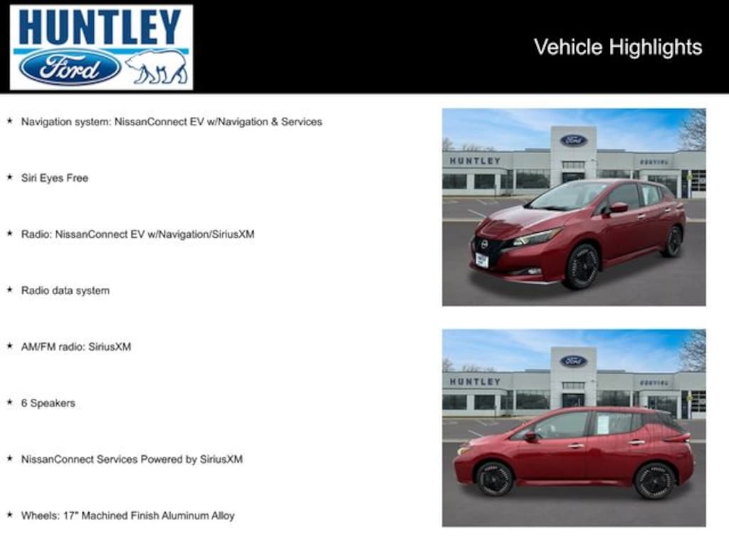 2023 Nissan Leaf 6 Speakers, AM/FM radio: SiriusXM, Navigation system: NissanConnect EV w/Navigation & Services, NissanConnect Services Powered by SiriusXM, Radio data system, Radio: NissanConnect EV w/Navigation/SiriusXM, Siri Eyes Free, Wheels: 17" Machined Finish Aluminum Alloy. Clean CARFAX. CARFAX One-Owner.
